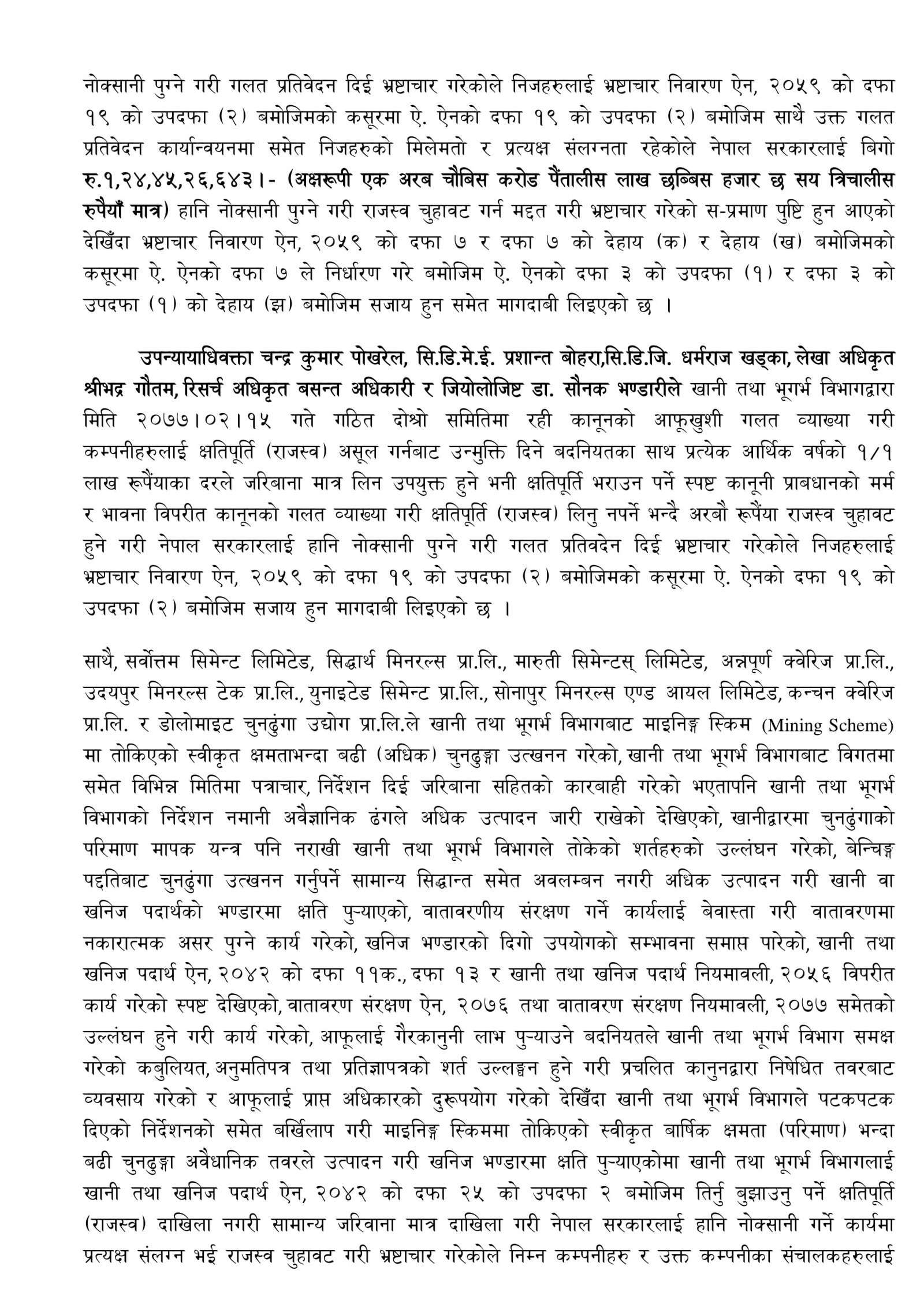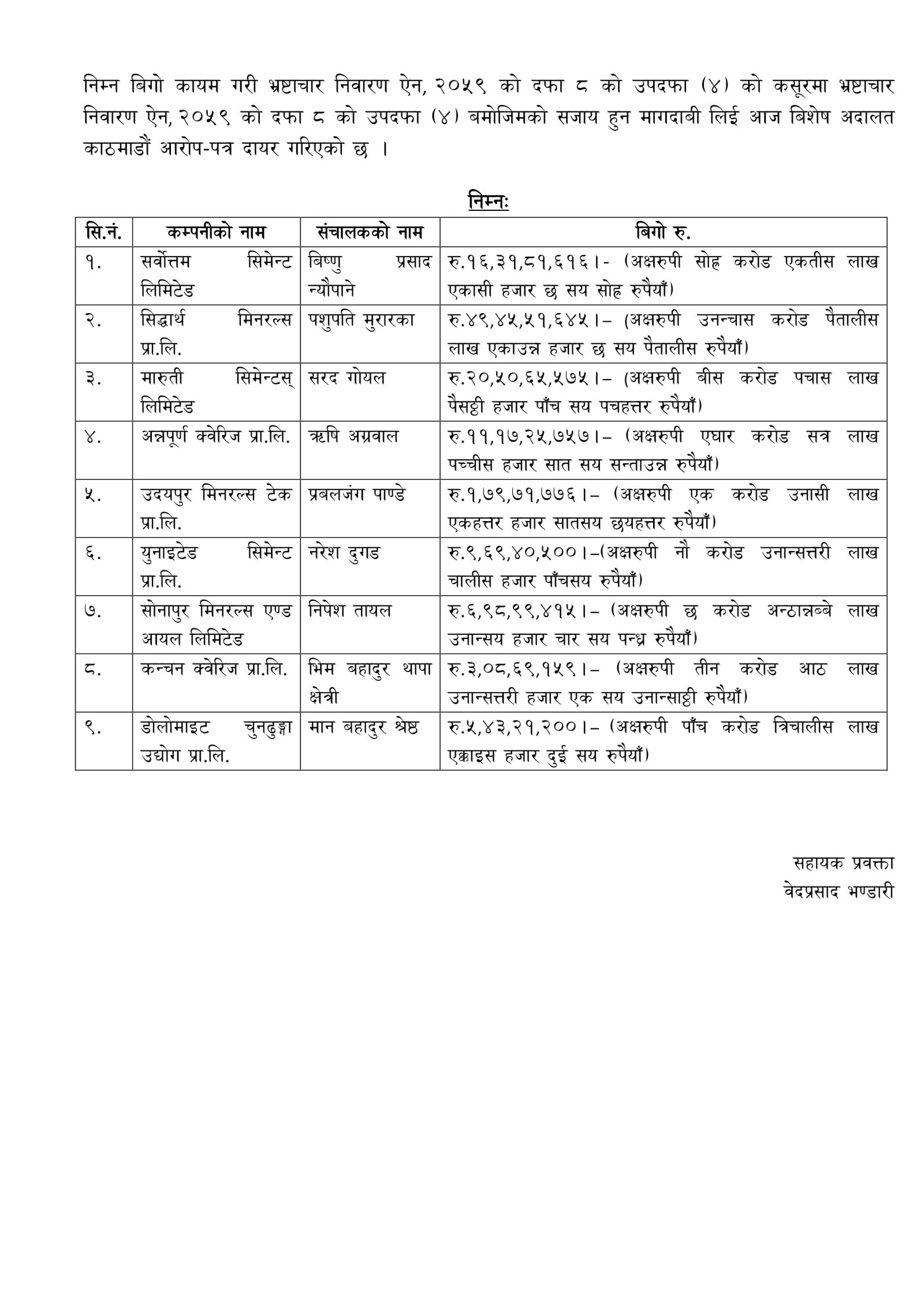 यसैगरी, सर्वोत्तम सिमेन्टका प्रबन्ध सञ्चालक विष्णुप्रसाद न्यौपाने, सिद्धार्थ मिनरल्स प्रालिका पशुपति मुरारका, मारुती सिमेन्टका शरद गोयल, अन्नपूर्ण कोएरिज प्रालिका ऋषि अग्रवाल, उदयपुर मिनरल्स टेक प्रवलजंग पाण्डे, युनाइटेड सिमेन्ट प्रालिका नरेश दुगढ, सोनापुर मिनरल्स प्रालिका निपेश टायल, कञ्चल कोयरिज प्रालिका भीमबहादुर थापा क्षेत्री र दोलोमाइट चुनढुंगा प्रालिका सञ्चालक मानबहादुर श्रेष्ठविरूद्ध भ्रष्टाचार मुद्दा दायर भएको छ ।