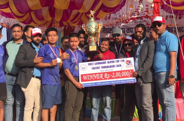 नवलपुर । नवलपरासी (बर्दघाट–सुस्तापूर्व)को गैँडाकोटमा सम्पन्न राष्ट्रियस्तरको प्रथम गैँडाकोट मेयर कप टी–ट्वान्टी क्रिकेट प्रतियोगिताको उपाधि नवलपुर क्रिकेट सङ्घले जितेको छ । आज सम्पन्न फाइनल खेलमा नवलपुरले स्याङ्जालाई पाँच विकेटले पराजित गर्दै उपाधि आफ्नो पोल्टामा पार्न सफल भएको हो ।
