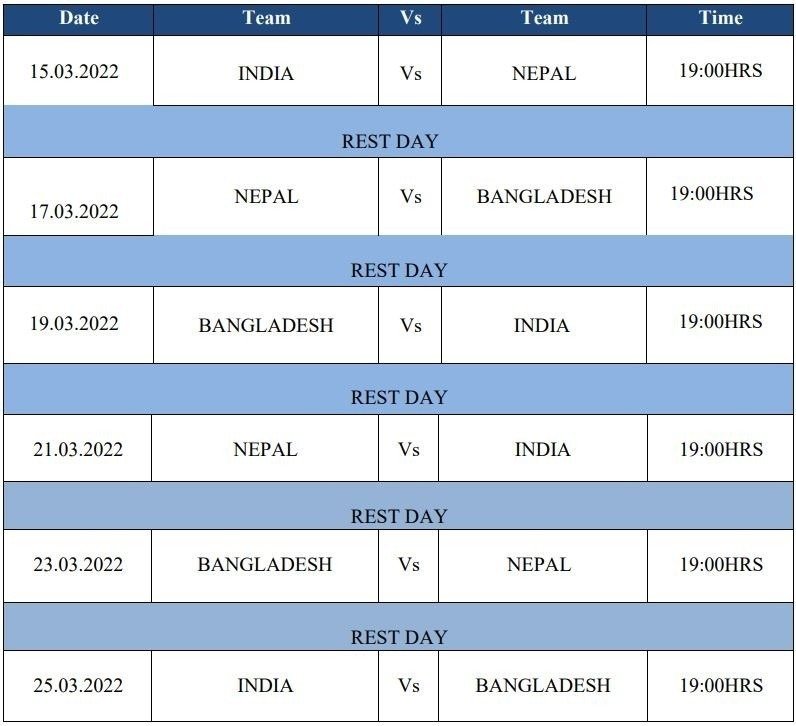 नेपालले १५ मार्चमा आयोजक भारतसँग खेल्दै प्रतियोगिताको शुरुवात गर्नेछ । दोस्रो खेल १७ मार्चमा बंगलादेशसँग खेल्नेछ भने २१ मार्चमा भारत र २३ मार्चमा बंगलादेशसँग खेल्दै प्रतियोगिताको अन्त्य गर्नेछ ।