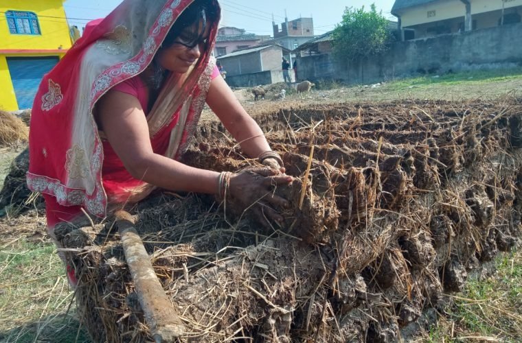 “के गर्नु पकाएर खानु परिहाल्छ”, धमाधम गोबरको चिपरी पथार्न व्यस्त देखिएकी बर्दिवास नगरपालिका–९ पशुपतिनगरकी गृहिणी शैलदेवी महतो भन्छिन्, “अहिले अन्य खेती कामको व्यस्तता नभएका बेला बर्खाभरिलाई चाहिने ‘चिपरी’ पथार्दै छु ।”