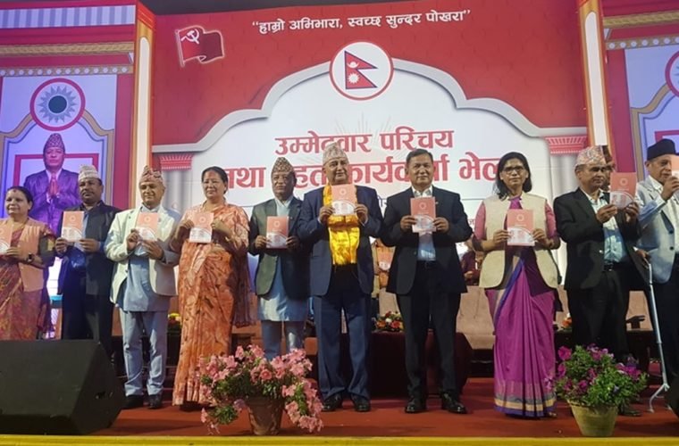 पोखरा । नेकपा एमाले पोखरा महानगरपालिका कमिटीले चुनावी घोषणापत्र सार्वजनिक गरेको छ । शनिबार एमाले वरिष्ठ उपाध्यक्ष ईश्वर पोखरेल, मेयरका प्रत्यासी कृष्णबहादुर थापा र उपमेयरकी प्रत्यासी मञ्जुदेवी गुरूङलगायतले चुनावी घोषणापत्र सार्वजनिक गरेका छन्