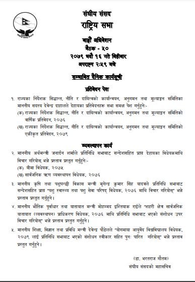 त्यस्तै बीमा विधेयक २०७५, सार्वजनिक ऋण व्यवस्थापन विधेयक २०७६, पशु स्वास्थ्य तथा पशु सेवा परिषद् विधेयक, २०७६ माथि विचार गरियोस् भन्ने प्रस्ताव, शहरी क्षेत्र सार्वजनिक यातायात व्यवस्थापन प्राधिकरण विधेयक, २०७६ माथि प्रतिनिधि सभाबाट भएको संशोधनउपर विचार गरियोस् भन्ने प्रस्ताव प्रस्तुत गर्ने कार्यसूची रहेको छ ।