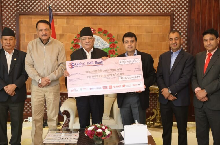 अध्यक्ष ढकालले ग्लोबल आइएमई बैंक लिमिटेड, आइजीआई प्रुडेन्सियल इन्स्योरेन्स, आइएमई लाइफ इन्स्योरेन्स र आइएमई लिमिटेडलगायत आइएमई ग्रुपबाट प्रवद्र्धित कम्पनी तथा आइएमई फाउन्डेसनमार्फत घोषणा गरिएको उक्त सहयोग रकमको चेक प्रधानमन्त्री दाहाललाई हस्तान्तरण गरेका हुन् ।