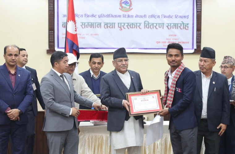 टी–२० विश्वकपमा छनोट भएको उपलक्ष्यमा सम्मान तथा अघिल्ला प्रतियोगिताहरूमा घोषणा गरिएको पुरस्कार रकम वितरण कार्यक्रममा प्रधानमन्त्रीले क्रिकेटमा नेपालको निकै राम्रो सम्भावना देखिएको भन्दै त्यसका लागि सरकारले रङ्गशाला बनाउने बताएका हुन् ।