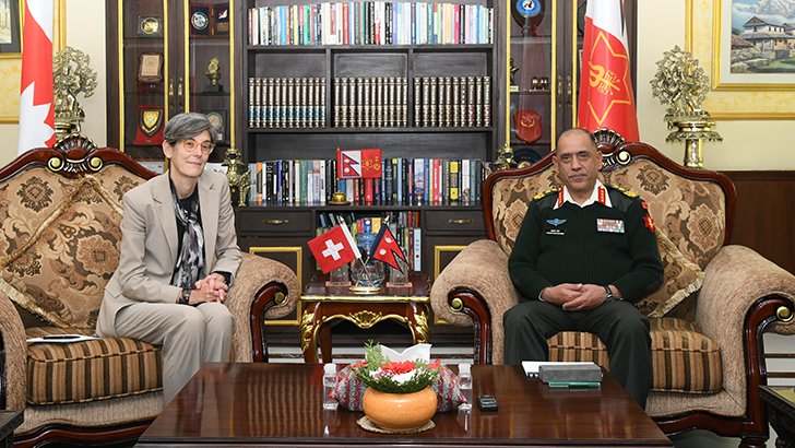 काठमाडौँ । प्रधानसेनापति प्रभुराम शर्मा र नेपालका लागि स्वीट्जरल्याण्डका राजदूत डा ड्यानियल म्युलीबीच जङ्गी अड्डामा शिष्टाचार भेट भएको छ ।