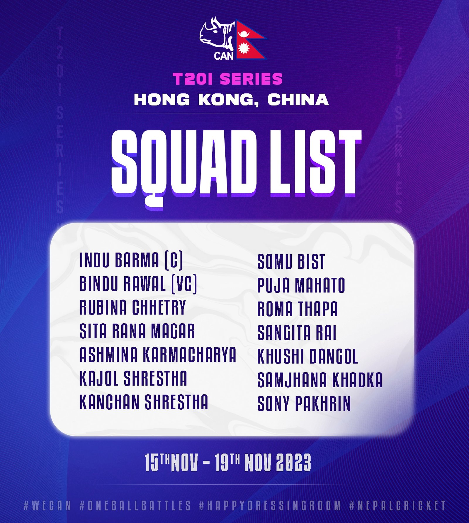 काठमाडौं । हङकङमा हुने चारदेशीय टी २० क्रिकेट सिरिजका लागि नेपाली टोली घोषणा भएको छ । नेपाल क्रिकेट संघ (क्यान) ले बिहीबार इन्दु बर्माको कप्तानीमा १४ सदस्यीय नेपाली महिला टिमको घोषणा गरेको हो । उपकप्तानको जिम्मेवारी विन्दु रावलले पाएकी छिन् ।
