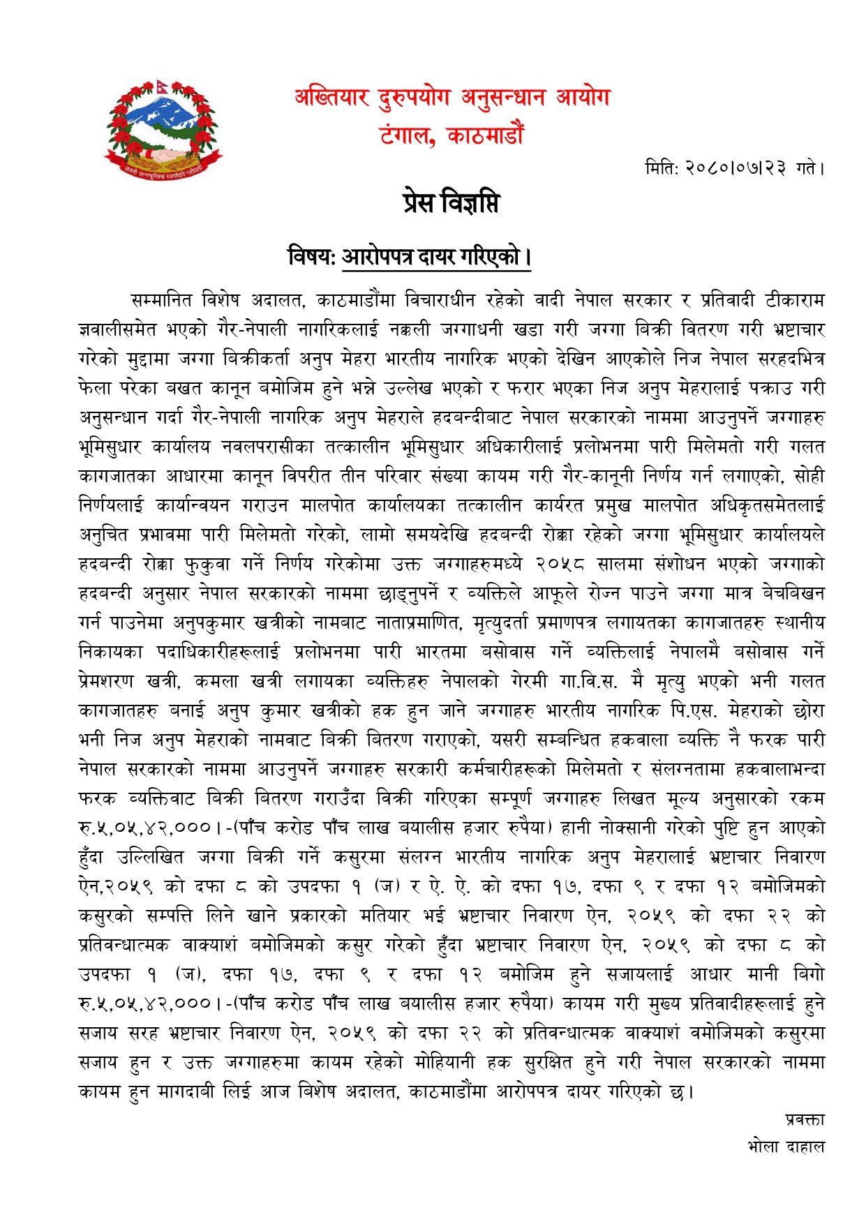 काठमाडौं । अख्तियार दुरुपयोग अनुसन्धान आयोगले सरकारको स्वामित्वमा आउनुपर्ने जग्गा कीर्ते कागजात बनाएर नक्कली जग्गाधनी खडा गरी ५ करोड रूपैयाँ भन्दाबढीमा बिक्री गरेको प्रकरणमा भारतीय नागरिकविरूद्ध भ्रष्टाचार मुद्दा दायर गरेको छ ।