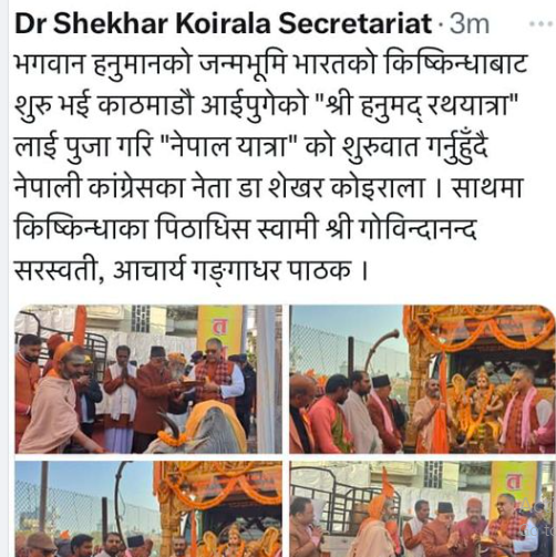 म आलोचनका लागि यो लेखेको हैन । कदापि पनि । यसमा बुराई वा निन्दनीय पनि केही छैन। तर हेर्दा मज्जा लाग्छ कि नेपाली कांग्रेसक आजका धेरैले आश राखेका नेताहरू खै कसको रिझ्याइँका लागि हो भारतका हिन्दू आराधना स्थलहरूलाई यहाँ नेपाल भित्र आपसमा बाँडेका छन् । अखबार, पत्रपत्रिकामा जताततै देखिन्छ। मधेसबाट उदाएका एक प्रमुख नेता विमलेन्द्र निधीले अयोध्यासम्म कालीगण्डकीबाट ल्याइएको अजंगे ढुंगोलाई पुर्याउन जोडतोडका साथ लागे । अहिले उतै कतै हुनुपर्छ । डा.शेखर कोइरालाले किस्किन्धाबाट आई नेपाल छिरेका श्री हनुमद् रथयात्रालाई ‘नेपाल यात्रा’ मा रूपान्तरित गरेका छन् । होनहार ठानिएका शशांक कोइराला–जाज्वल्यमान युवा नेता शंकर भण्डारीहरूले गोरखमठलाई तारणहार बनाएका छन् । गुरू गोरखनाथले दिएको दही पृथ्वीनारायण शाहको पाउमा खस्दा–’यो पाउँ जहाँ जहाँ पुग्छ, त्यो स्थान विजयी हुनेछ।’ भन्ने मिथकीय इतिहासबाट अनुप्राणित भई संघीयता तथा गणतन्त्रलाई खतम बनाउन गोरखमठलाई परमधाम बनाएका छन् । साथै फेरि आरजु म्याडमजीले चौथाईबालेलाई उतिकै श्रद्धावत् स्तुत्य बनाउनु भएको छ । यस्ता उदाहरणहरू लामै हुन सक्छ । त्यो बीपीहरूले सिर्जेको कांग्रेसको क्रान्तिचेत अहिले मुलुकमा सम्पन्नता तथा समुन्नतिको लागि यस्तो अभियानमा लागेको छ। यी सब करतूतहरूको किन आलोचना गर्नु ? शायद‘ कहीँ त पुग्न खोज्दैछ कांग्रेस ।