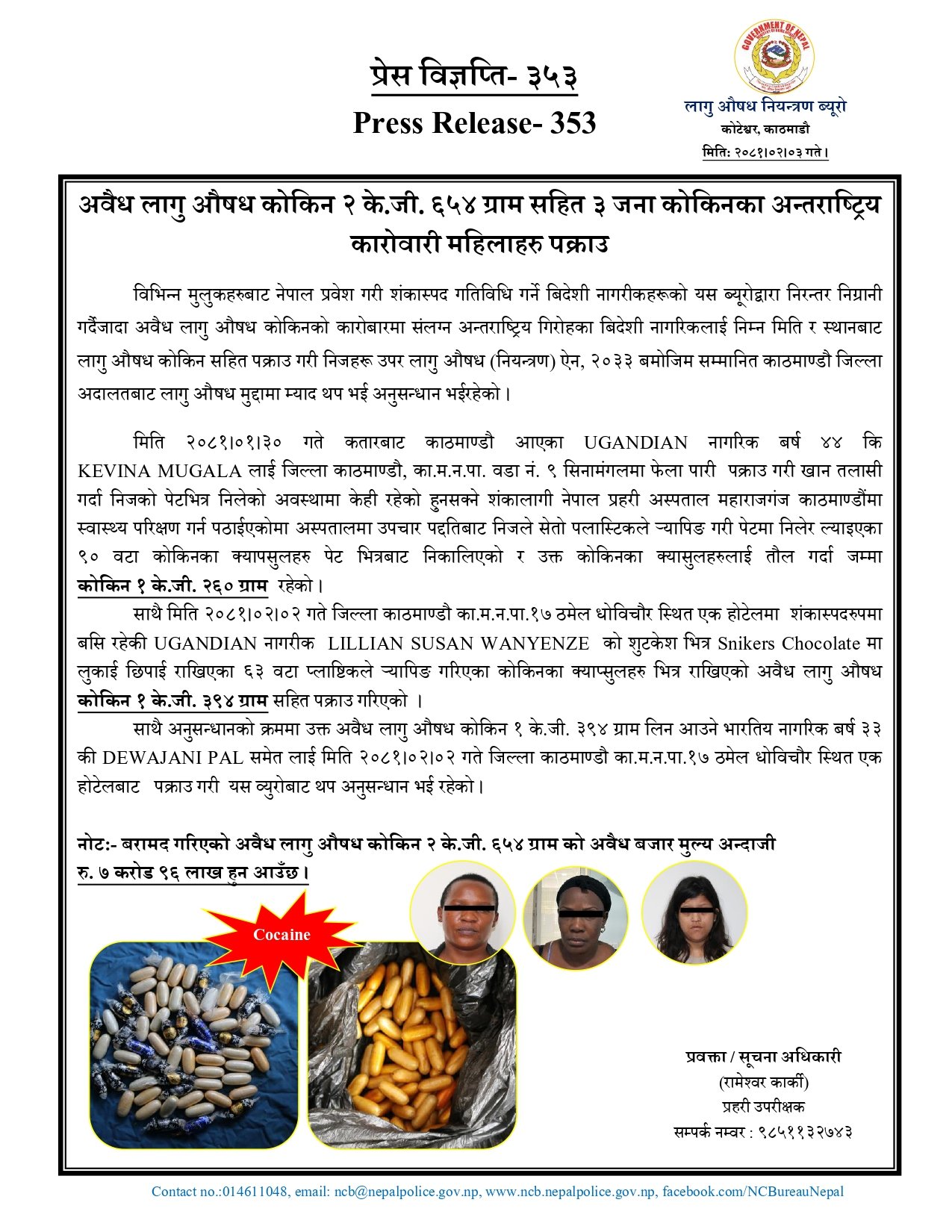 उनले भने, ‘कतार एयरवेजबाट काठमाडौँ ओर्लिएका युगाण्डा घर भएका केभिना मुगाला र लिलियन सुशान वानयेन्जेबाट आगुऔषध कोकिन बरामद गरिएको छ, जसको तौल दुई केजी छ सय ५४ ग्राम रहेको छ ।’