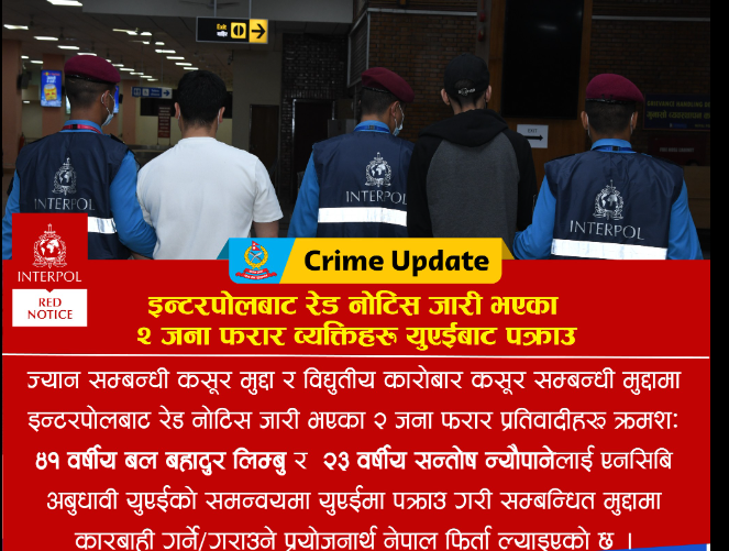 प्रहरी प्रधान कार्यालय इन्टरपोल शाखाले ज्यानसम्बन्धी कसुर मुद्दा र विद्युतीय कारोबार कसुरसम्बन्धी मुद्दामा रेड नोटिस जारी भएका दुई जना फरार प्रतिवादीलाई पक्राउ गरी नेपाल ल्याएर शुक्रबार सार्वजनिक गरेको हो । पक्राउ पर्नेमा मोरङ लेटाङ नगरपालिका–३ का ४१ वर्षीय बलबहादुर लिम्बू र नवलपरासी पूर्वमध्यबिन्दु नगरपालिका–१३ का २३ वर्षीय सन्तोष न्यौपाने रहेका छन् ।