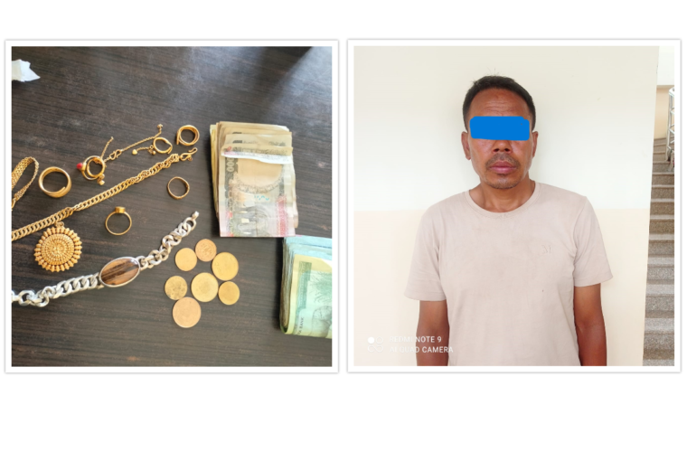 प्रहरीले उनको साथबाट १. सुनको औठी थान ४, सुनको सिक्री एक थान, सुनको लकेट थान १, सुनको व्रासलेट थान २, सुनको कानमा लगाउने रिङ थान २, सुनको सिक्रीको टुक्रा थान १, चाँदीको ब्रासलेट थान १, खुकुरी थान २ र नगद १३ हजार चार सय बरामद गरेको प्रहरीले जनाएको छ ।