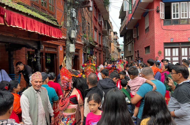 रमेश गिरी, भक्तपुर ।  मध्यपुरथिमि नगरपालिका क्षेत्रमा परम्परागत बाजा र देवीदेवताको नाच प्रदर्शन भइरहेको छ।गाईजात्राको भोलिपल्ट  द्वितीयादेखि पच्चमी अर्थात शनिबार रातिसम्म तीन दिन र चार रात टोलटोलमा विभिन्न देवी देवताका मुकुण्डो धारण गरेको हातमा विभिन्न देवी देवताले बोक्ने हतियार बोकेर नील बाराही, भैरव र महाकाली विभिन्न देवी देवताका प्रतीक देवगणका नाचिरहेका छन् ।
