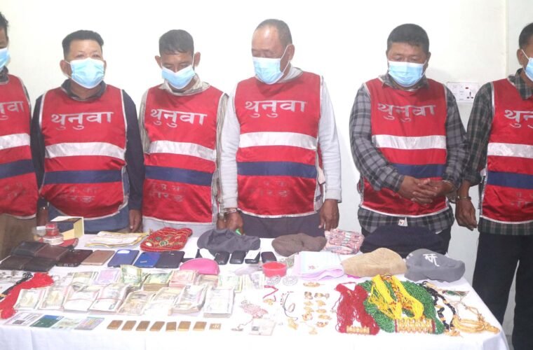 झापाको तोपगाछी गाउँपालिका–१ का ५२ वर्षीय अशोक तामाङ, अर्जुनधारा नगरपालिका–११ का ५४ वर्षीय प्रविन तामाङ, हल्दीबारी नगरपालिका–३ बाघडाँडाका ६६ वर्षीय रामबहादुर कन्दङ्गवा, कन्काई नगरपालिकाका–९ का ५९ वर्षीय धकलबहादुर थिङ, भारत पश्चिम बङ्गाल दार्जेलिङ जिल्ला नक्सलबारीका ५१ वर्षीय नारायण गुरुङ, सोही स्थानका ३४ वर्षीय सञ्जय शर्मालाई पक्राउ गरी सार्वजनिक गरिएको जिल्ला प्रहरी कार्यालयका प्रमुख प्रहरी उपरीक्षक नारायणप्रसाद चिमरियाले जानकारी दिए ।