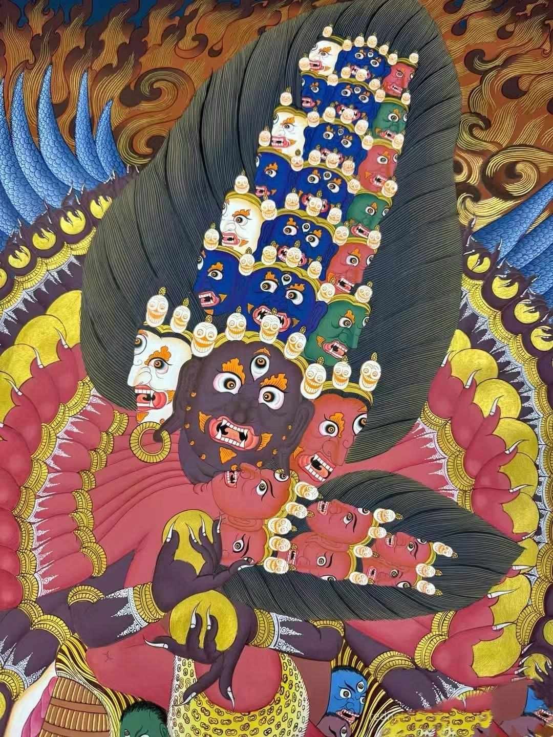 उनी निलो–कालो रंगका, एक मुख, छ भुजा, तीन रातो आँखा (जुन बिजुलीजस्तै चम्किन्छन्), निधारमा सिलौटा, भौंहरू क्रोधित, चारवटा तिखा दाँत बाहिर निस्केका, पाँच खोप्टीको मुकुट, रातो–पहेंलो कपाल ठाडो उभिएका, दाढी र भौंहहरू आगोजस्तै रातो, जिब्रो हल्लाएर ‘हाहा’ आवाज निकाल्ने (जस्तो बज्रपातको आवाज)। दायाँ पहिलो हातमा खड्ग (खुकुरी), दोस्रोमा मुण्डको माला, तेस्रोमा डमरू , बायाँ पहिलो हातमा रक्तले भरिएको खोप्टी, दोस्रोमा त्रिशूल र तेस्रोमा वज्र डोरी रहेको देखिन्छ।