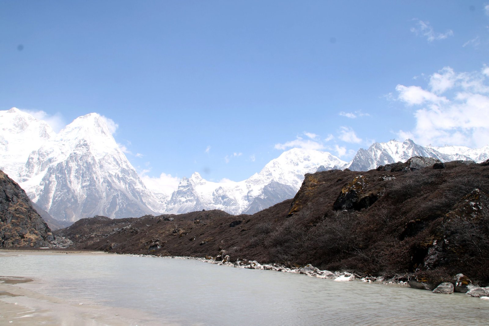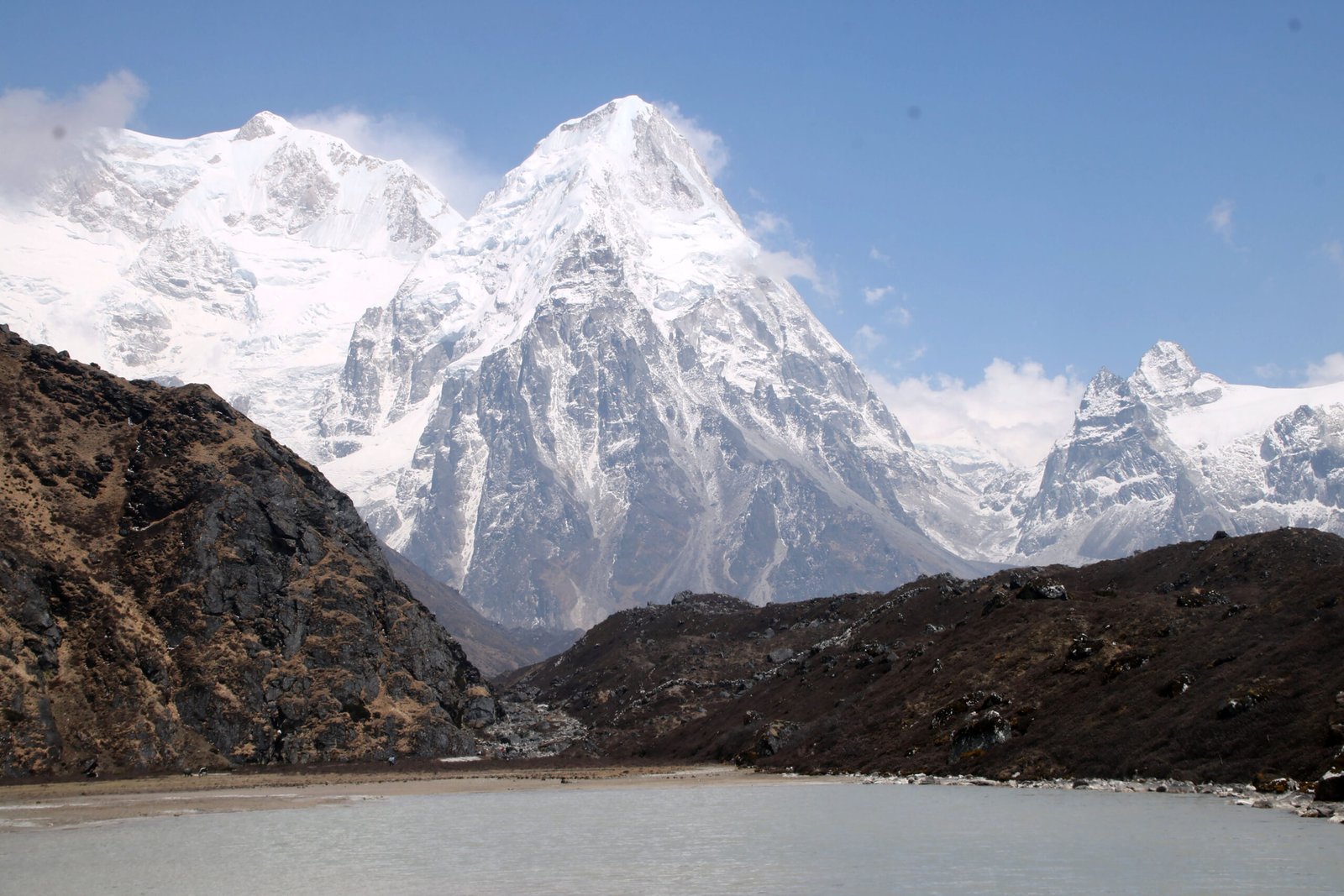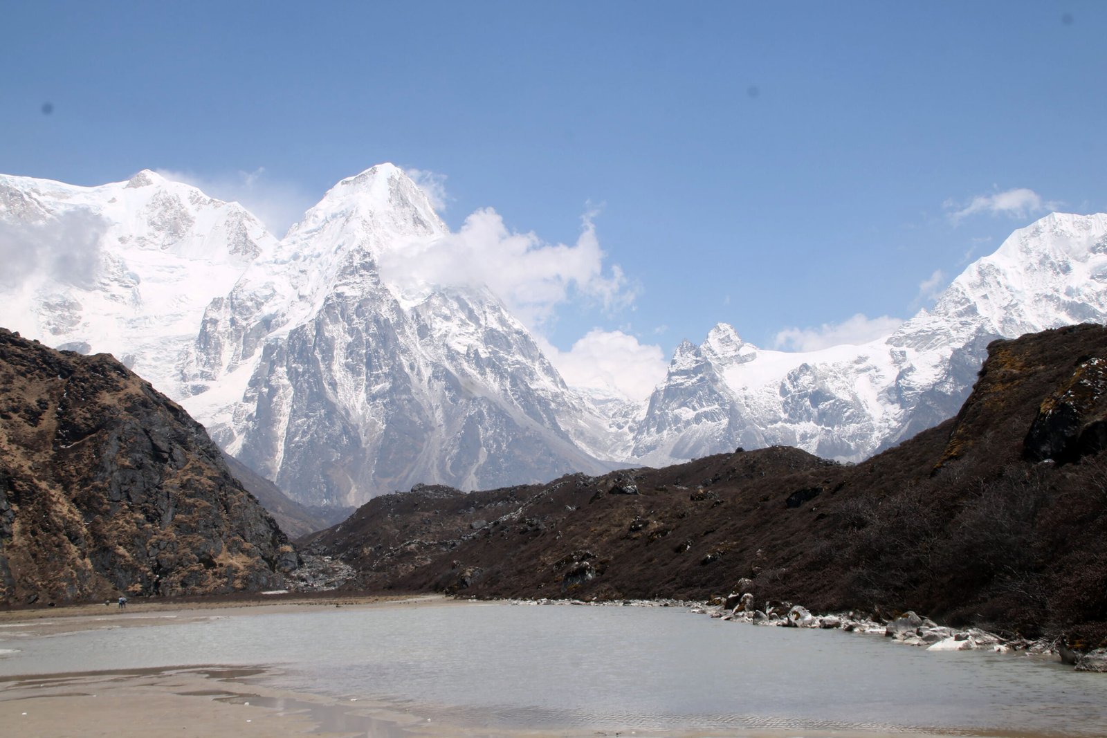 ताप्लेजुङको सिरिजङ्घा–८, रामचेरस्थित लाप्साङ पोखरी र पृष्ठभूमिमा देखिएका राथोङ पिक र कञ्चनजङघा हिमालका हिमशृङ्खला। यो क्षेत्र कञ्चनजङ्घा दक्षिण आधारशिविर मार्गमा पर्छ ।