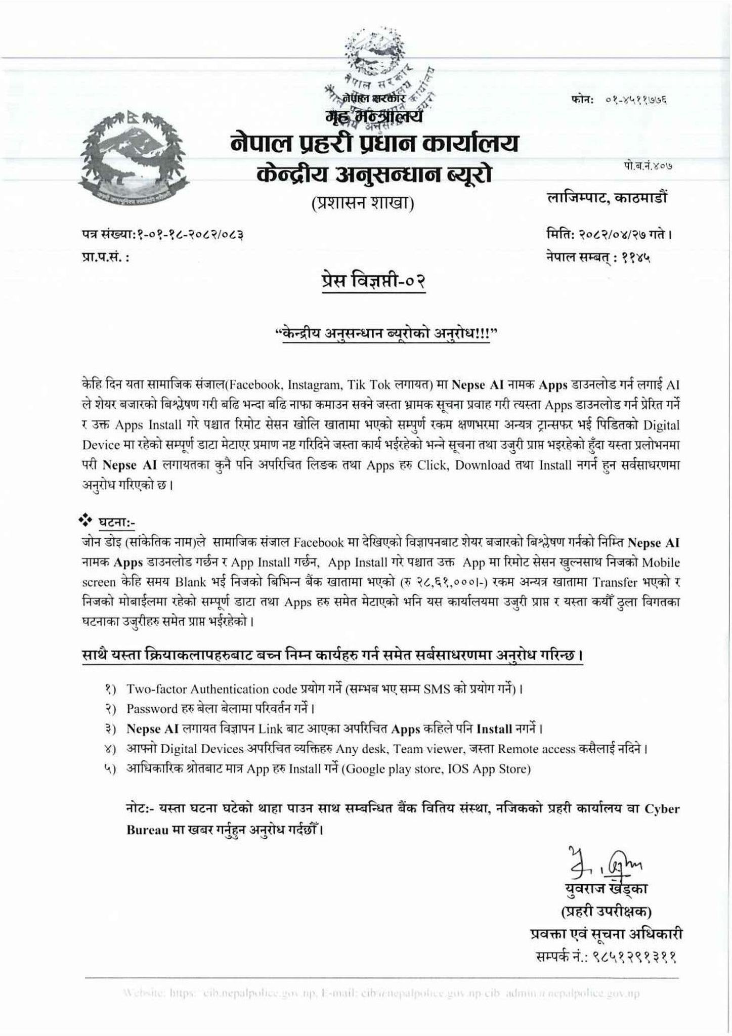 आफ्नो डिजिटल डिभाइस अपरिचित व्यक्तिलाई कुनै पनि प्रकारको जानकारी नदिने र आधिकारिक स्रोतबाट मात्र एपहरु इन्स्टल गर्नुपर्छ । त्यस्तै यस्ता घटना घटेको थाहा पाउन साथ सम्बन्धित बैंक वित्तीय संस्था, नजिकको प्रहरी कार्यालयमा खबर गर्नुहुन साइबर ब्यूरोले आग्रह गरेको छ ।