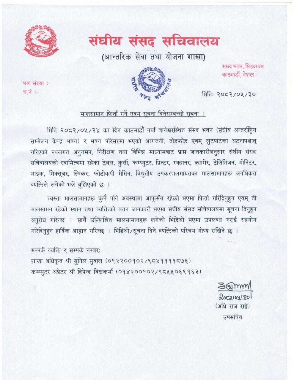 काठमाडौं ।  संघीय संसद् सचिवालय यही २४ भदौमा भएको जेन–जी प्रदर्शनका क्रममा संसद् भवनबाट लगिएको सामान फिर्ता गर्न अनुरोध गरेको छ ।