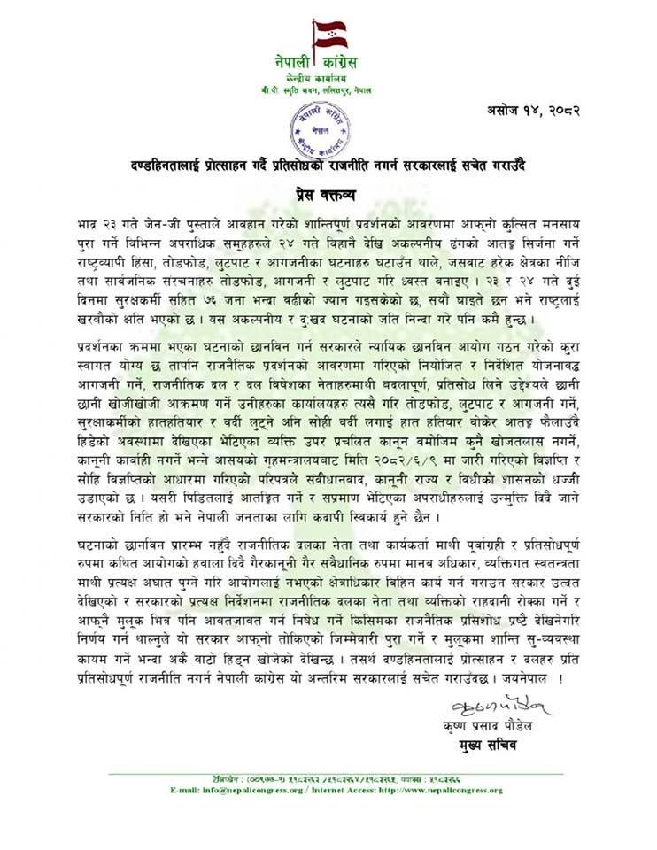 काठमाडौं । नेपाली कांग्रेसले भदौ २४ का आक्रमणकारीलाई उन्मुक्ति दिने कार्य स्वीकार्य नहुने बताएको छ । बुधबार कांग्रेस मुख्यसचिव कृष्णप्रसाद पौडेलले विज्ञप्ति जारी गरी अपराधीहरुलाई उन्मुक्ति दिने आशयको गृह मन्त्रालयले विज्ञप्ति जारी गरेको भन्दै कांग्रसले आपत्ति जनाएको हो ।