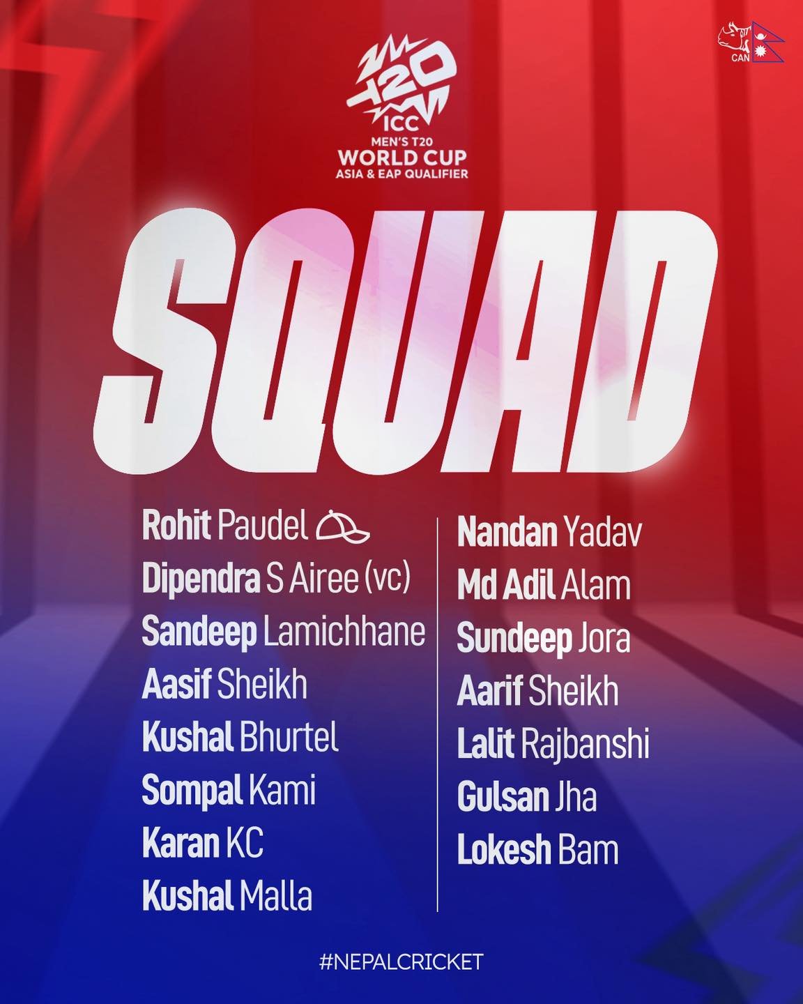 नेपाली टोलीमा कप्तान पौडेलसहित दीपेन्द्र सिंह एरी(उपकप्तान), सन्दीप लामिछाने, आसिफ शेख, कुशल भुर्तेल, सोमपाल कामी, करण केसी, कुशल मल्ल, नन्दन यादव, मोहम्मद आदील अलाम, सन्दीप जोरा, आरिफ शेख, ललित राजवंशी, गुलसन झा र लोकेश बम रहेका छन् ।