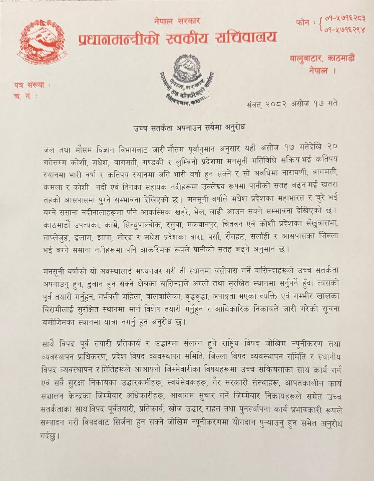 काठमाडौं । प्रधानमन्त्री तथा मन्त्रिपरिषदको कार्यालयले असोज २० गतेसम्म देशका विभिन्न भागमा भारी वर्षा भई बाढी–पहिरोको जोखिम बढ्ने जल तथा मौसम विज्ञान विभागले पूर्वानुमान गरेकाले सबैलाई उच्च सतर्कता अपनाउन आग्रह गरेको छ ।