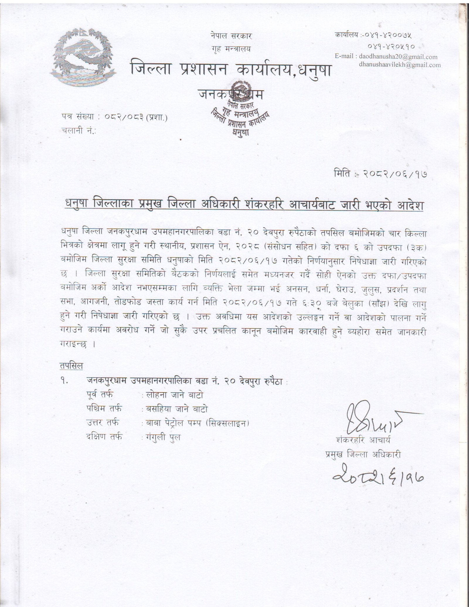 जनकपुरधाम । जिल्ला प्रशासन कार्यालय धनुषाले कर्फ्यू आदेश जारी गरेको छ । शुक्रबार साँझ ६ः३० बजेदेखि वडा नम्बर २० का विभिन्न स्थानमा कर्फ्यू आदेश जारी गरेको हो ।