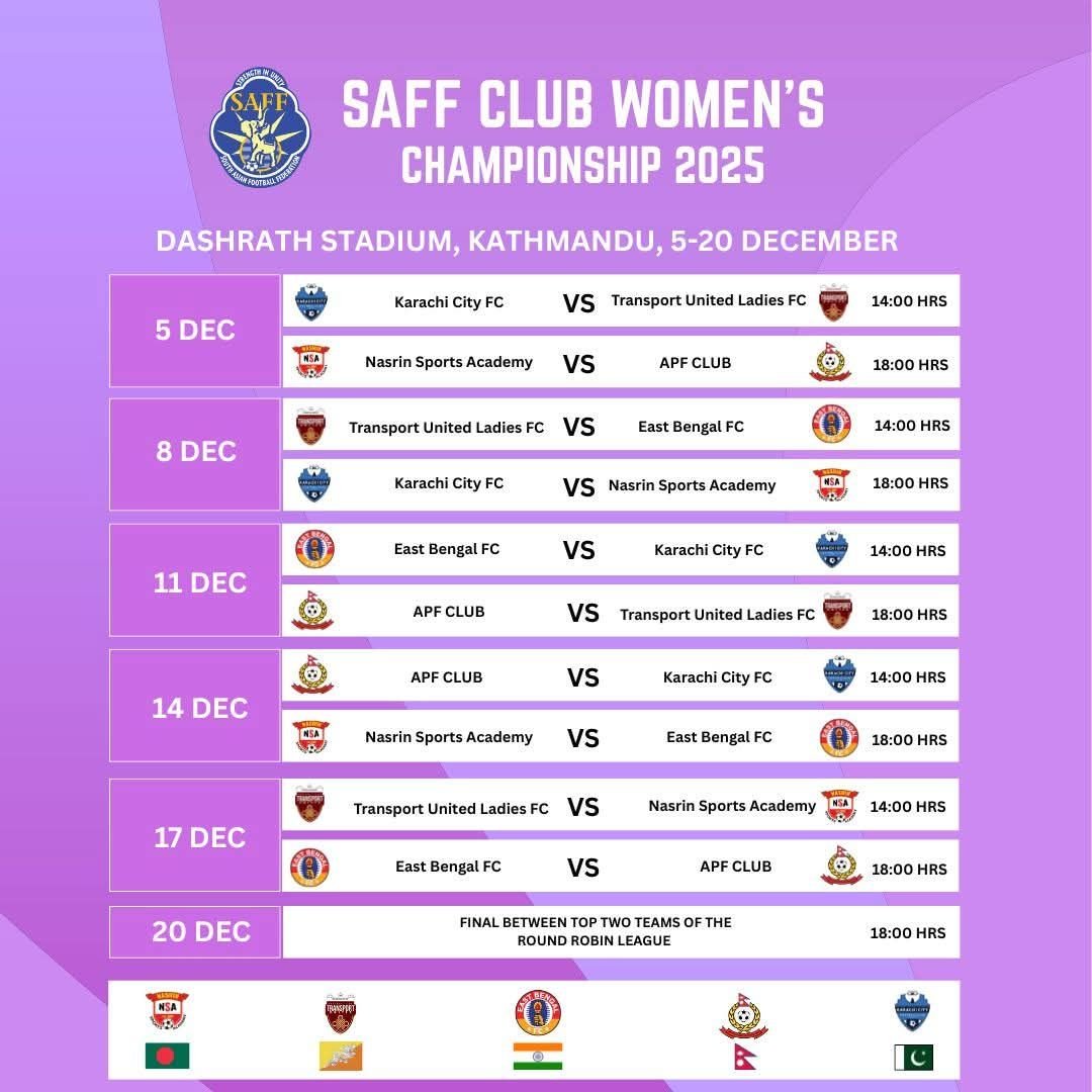 काठमाडौं । साफ क्लब महिला च्याम्पियनसिप-२०२५ को खेलतालिका सार्वजनिक भएको छ । दक्षिण एसियाली फूटबल महासंघ(साफ)ले सार्वजनिक गरेको खेलतालिका अनुसार पहिलो खेलमा पाकिस्तानको काराची सिटी फूटबल क्लब र भुटानको ट्रान्सपोर्ट युनाइटेड लेडिज फूटबल क्लब भिड्नेछन् ।