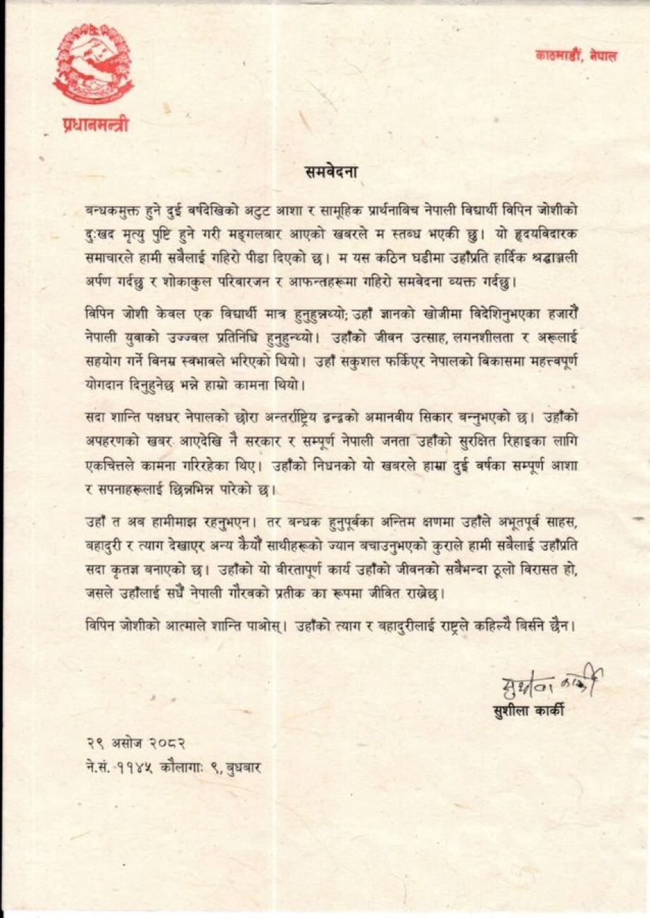 काठमाडौं । प्रधानमन्त्री सुशीला कार्कीले हमासबाट हत्या गरिएका नेपाली युवक विपिन जोशीको त्याग र बहादुरीलाई राष्ट्रले कहिल्यै पनि नबिर्सने बताएकी छिन् ।