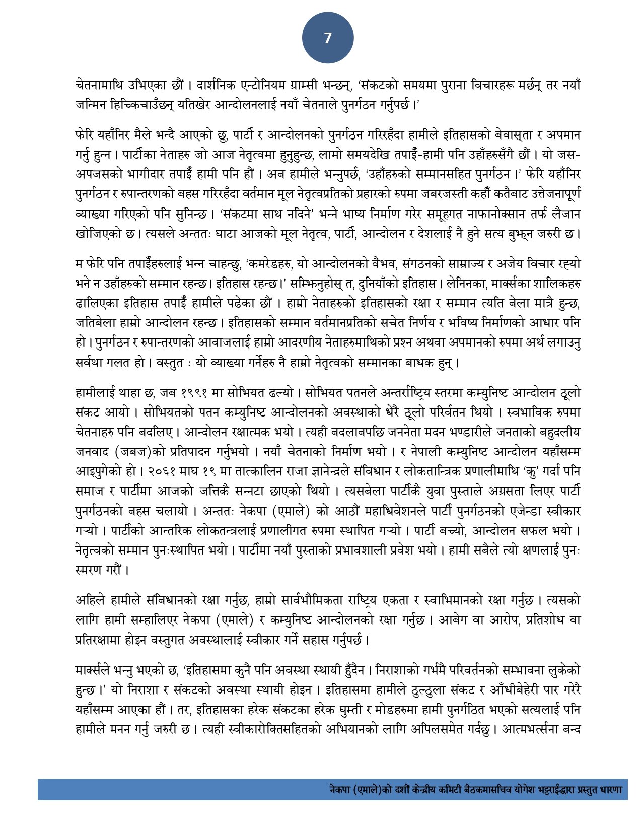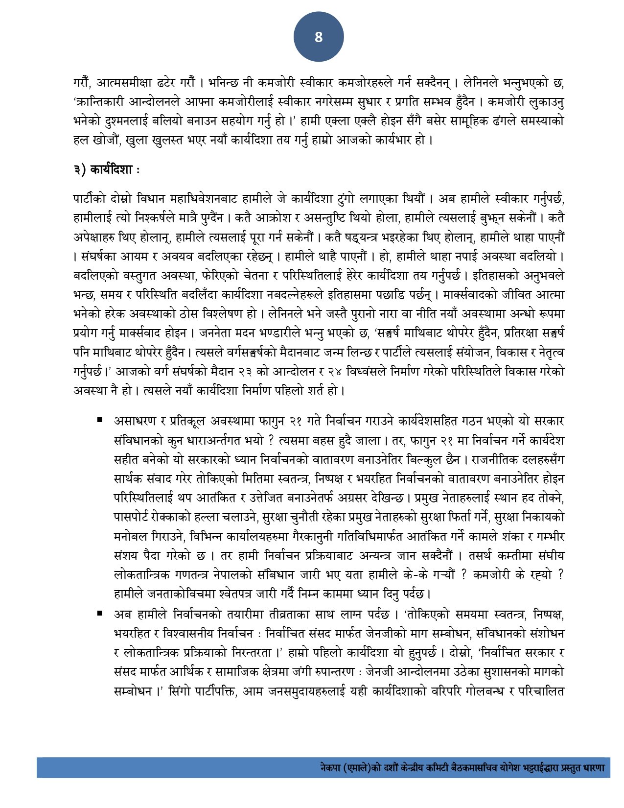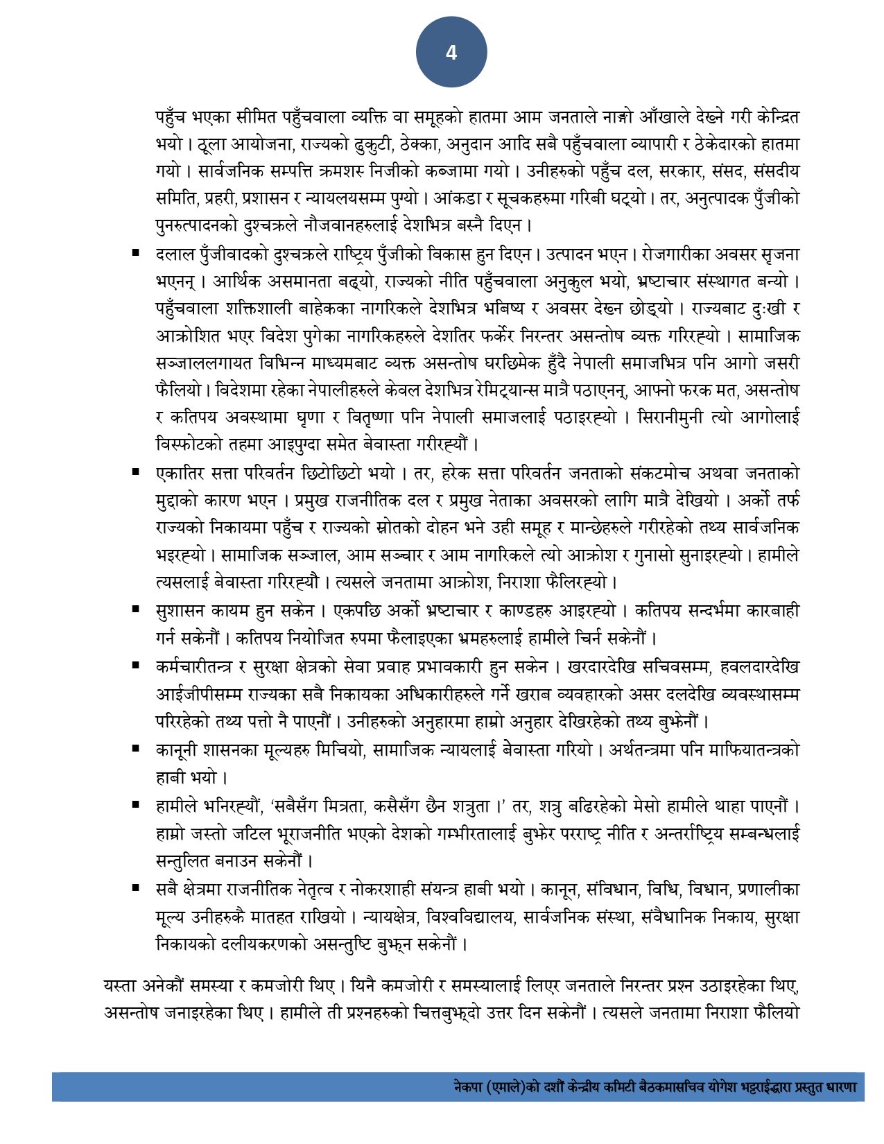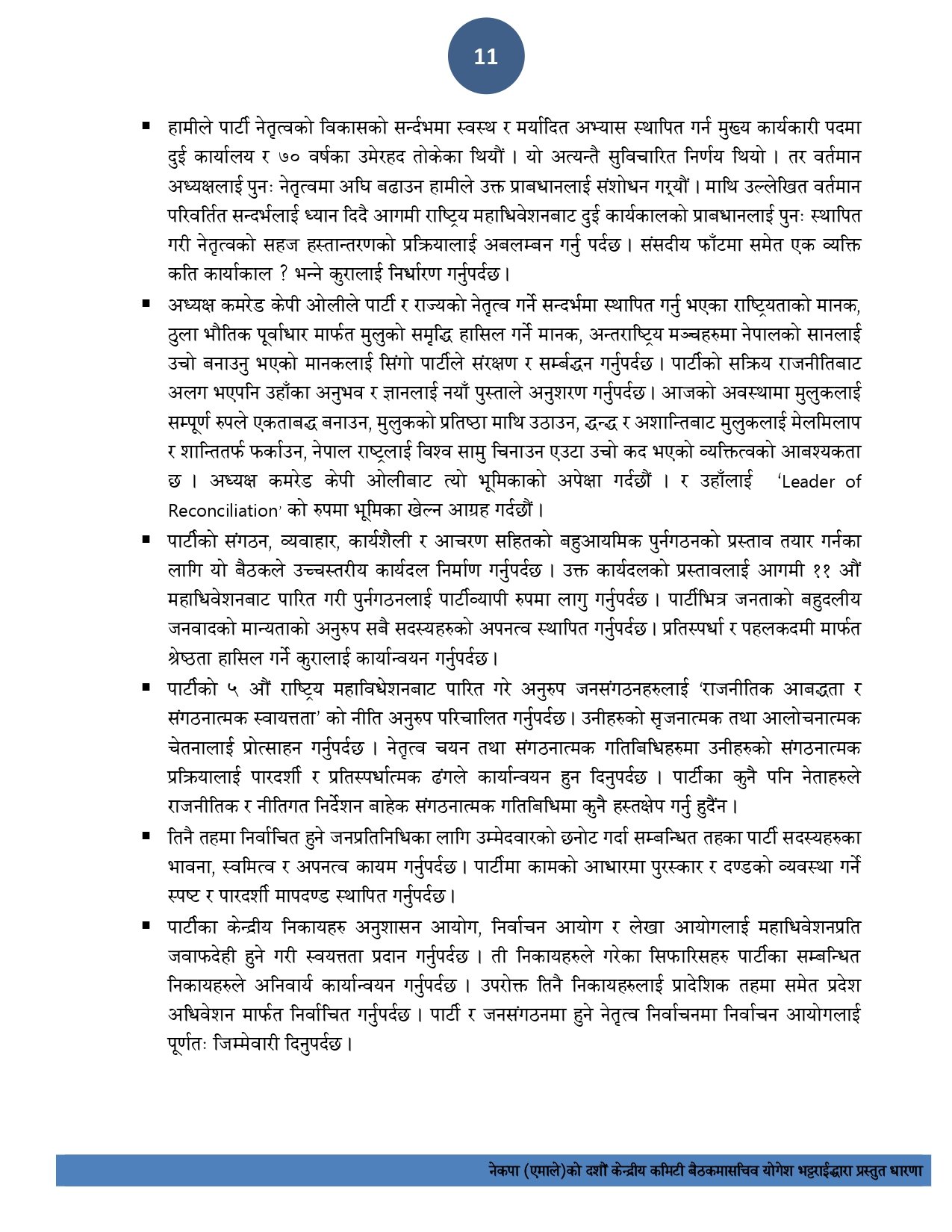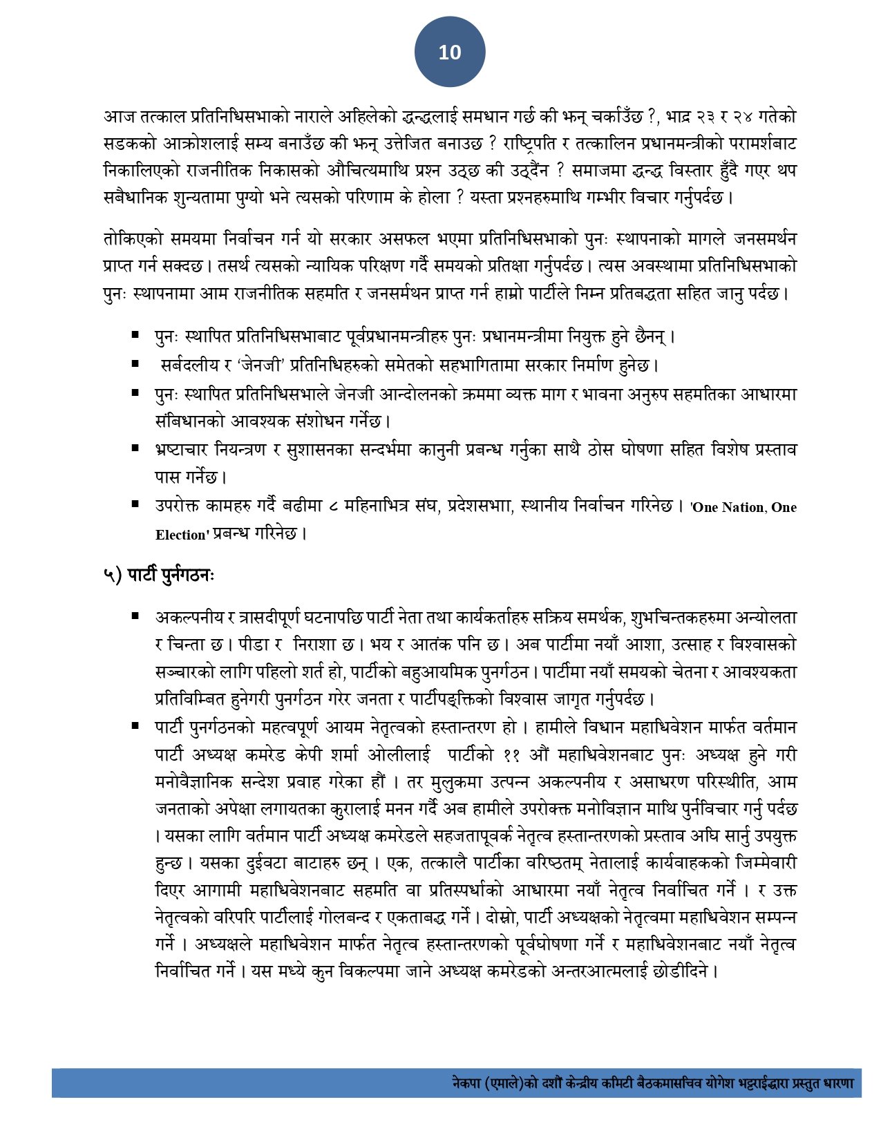 उनले पार्टीमा नयाँ समयको चेतना र आवश्यकता प्रतिविम्बित हुनेगरी पुनर्गठन गरेर जनता र पार्टीपङ्क्तिको विश्वास जागृत गर्नुपर्ने बताए ।