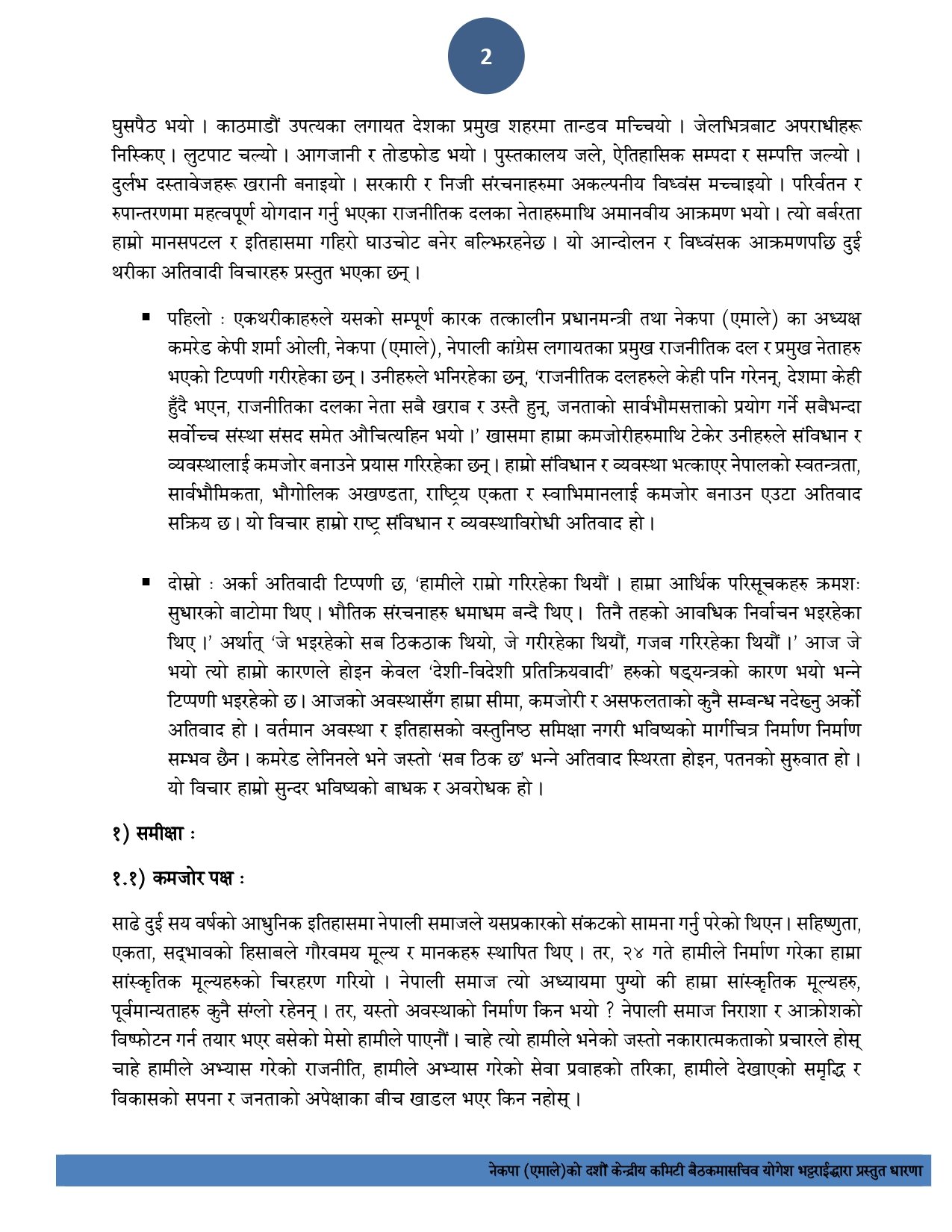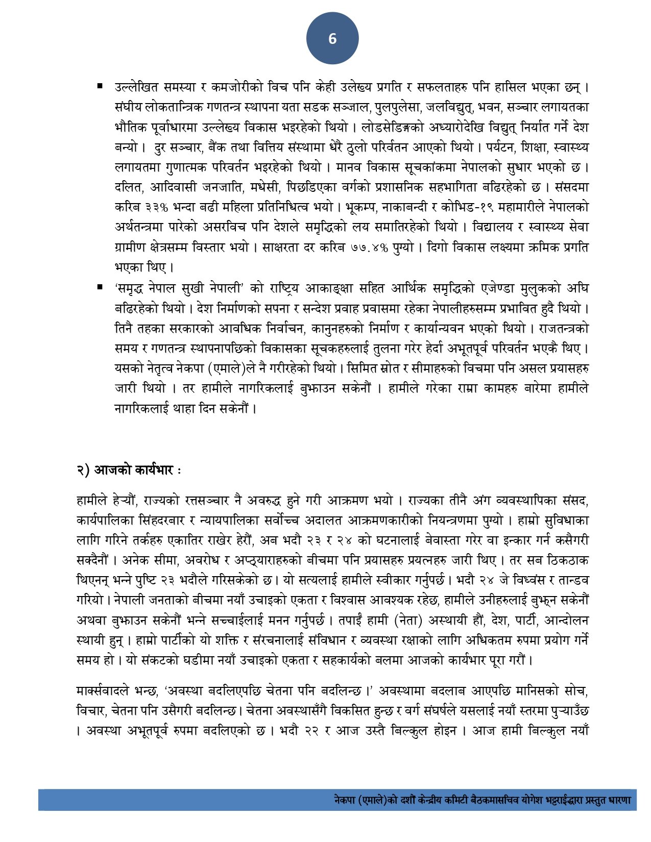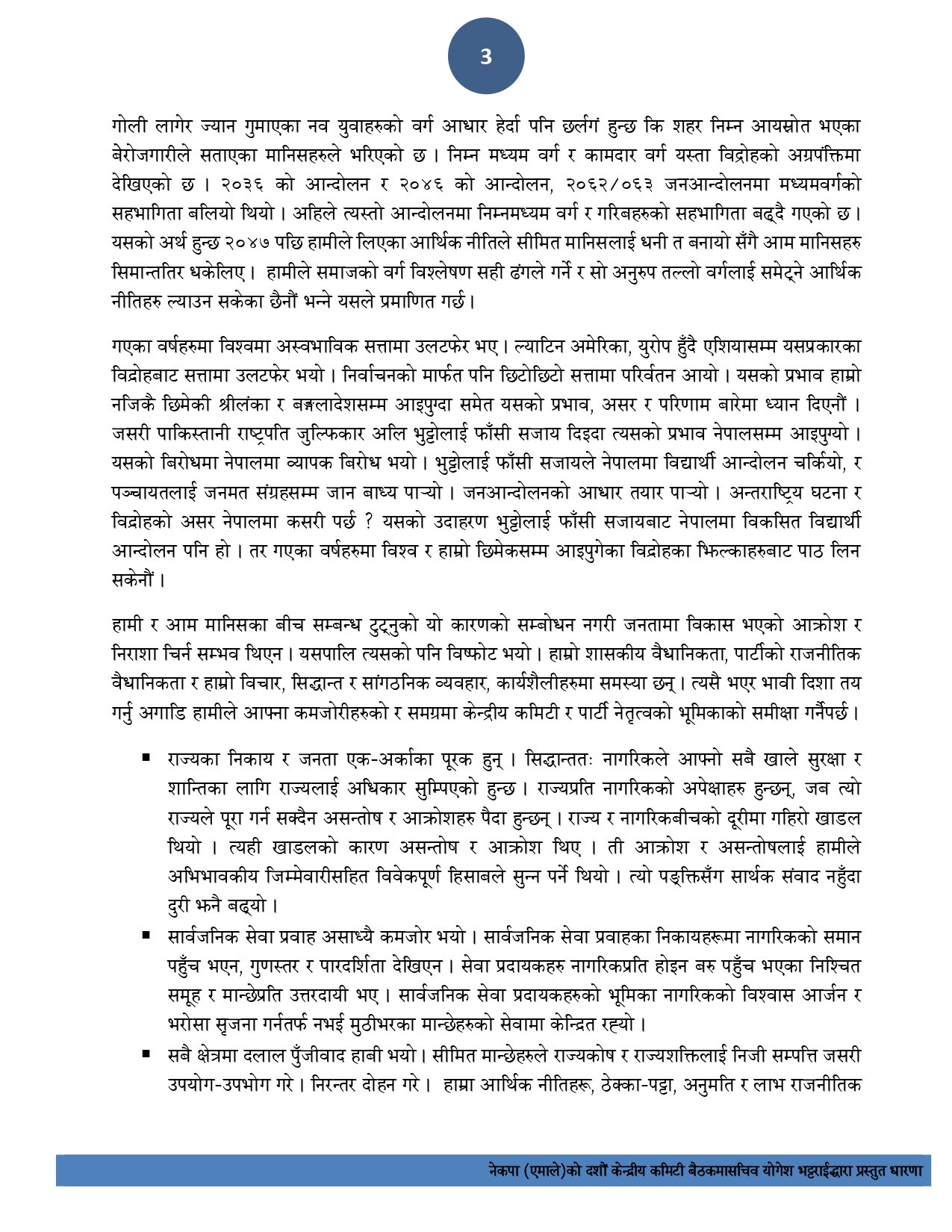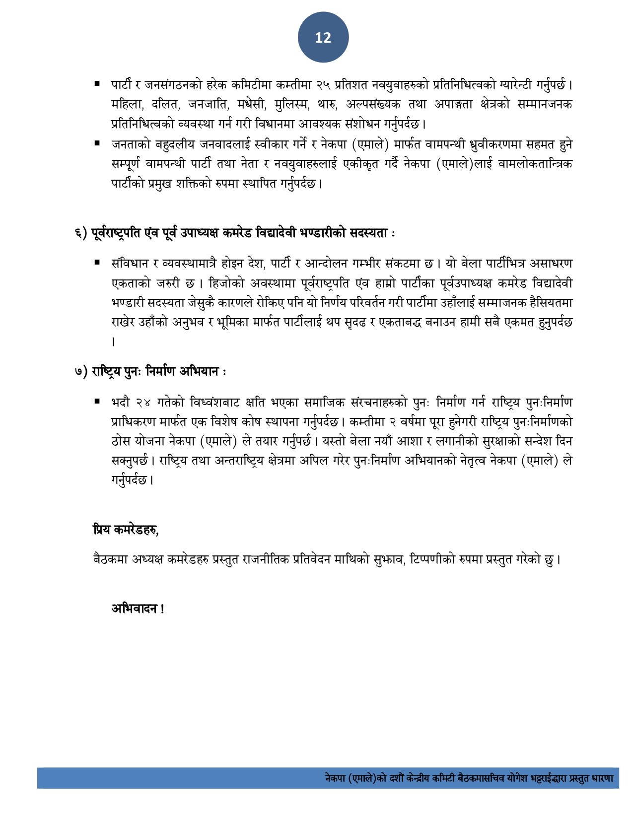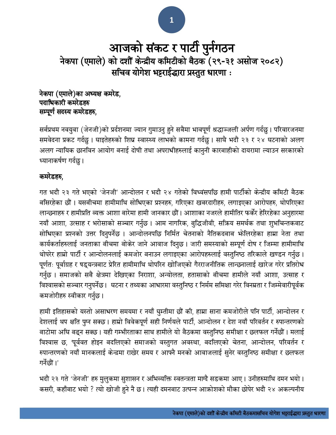उनले पार्टीमा नयाँ समयको चेतना र आवश्यकता प्रतिविम्बित हुनेगरी पुनर्गठन गरेर जनता र पार्टीपङ्क्तिको विश्वास जागृत गर्नुपर्ने बताए ।