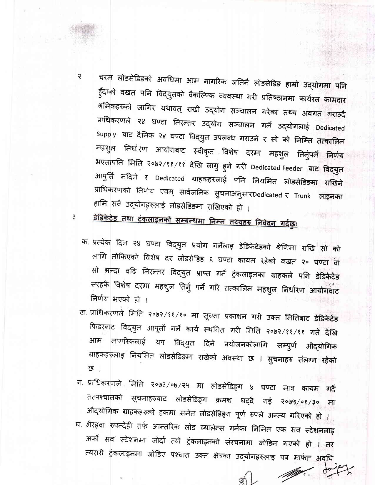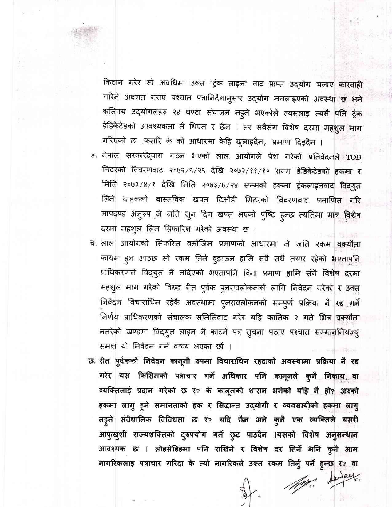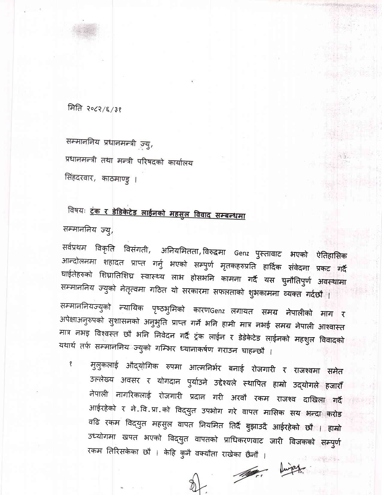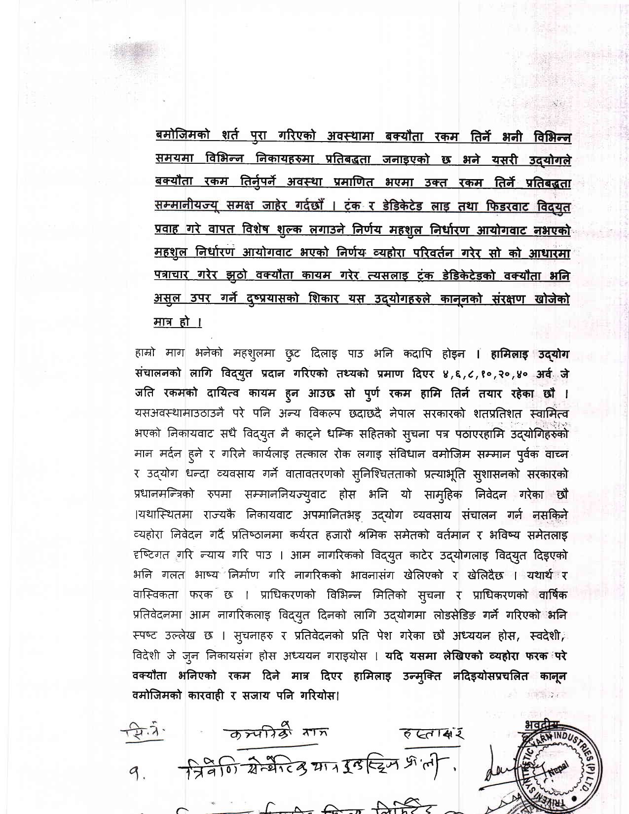 उनीहरुले प्रमाणविना भुक्तानी नगर्ने भन्दै प्रधानमन्त्रीलाई पत्र लेखेका हुन् । नेपाल विद्युत् प्राधिकरणले डेडिकेटेड लाइनको बक्यौता महसुल नतिरे लाइन काट्ने चेतानवनीसहितको पत्र पठाएपछि २६ वटा उद्योगले प्रधानमन्त्रीलाई पत्र लेखेर न्याय मागेका छन् ।