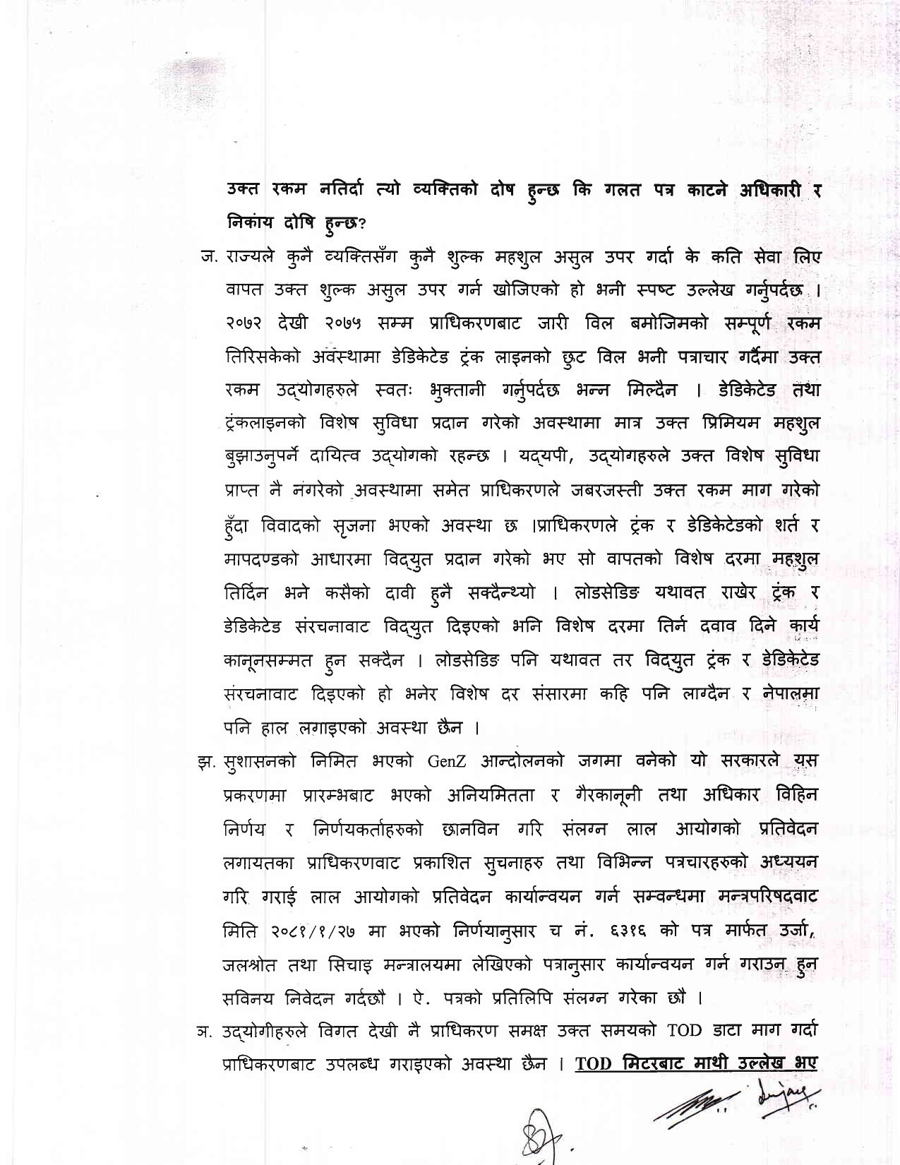 यही विद्युत महसुल विवादका कारण तत्कालीन प्राधिकरणका कार्यकारी निर्देशक कुलमान घिसिङ र ओली सरकारबीच विवादसमेत भएको थियो । सो विवाद चर्किँदै जाँदा घिसिङ बर्खास्त भएका थिए । अहिले जेनजी आन्दोलनपछि घिसिङ ऊर्जामन्त्री बनेका छन् । उनले पदाभार ग्रहण गर्ने बेला नै उद्योगीसँगको सो विवादित रकम असुल गर्ने निर्णय गरेका थिए ।