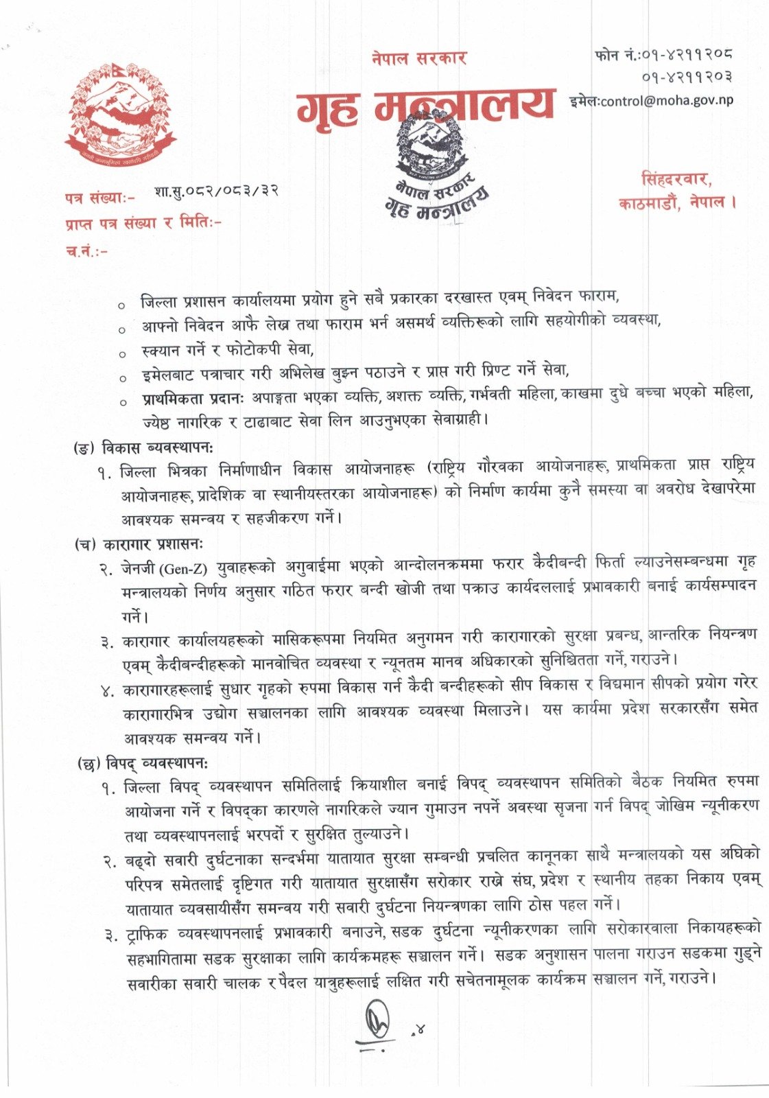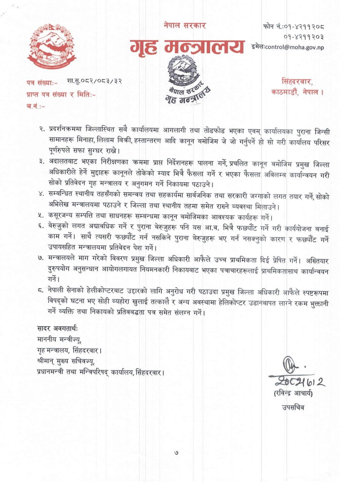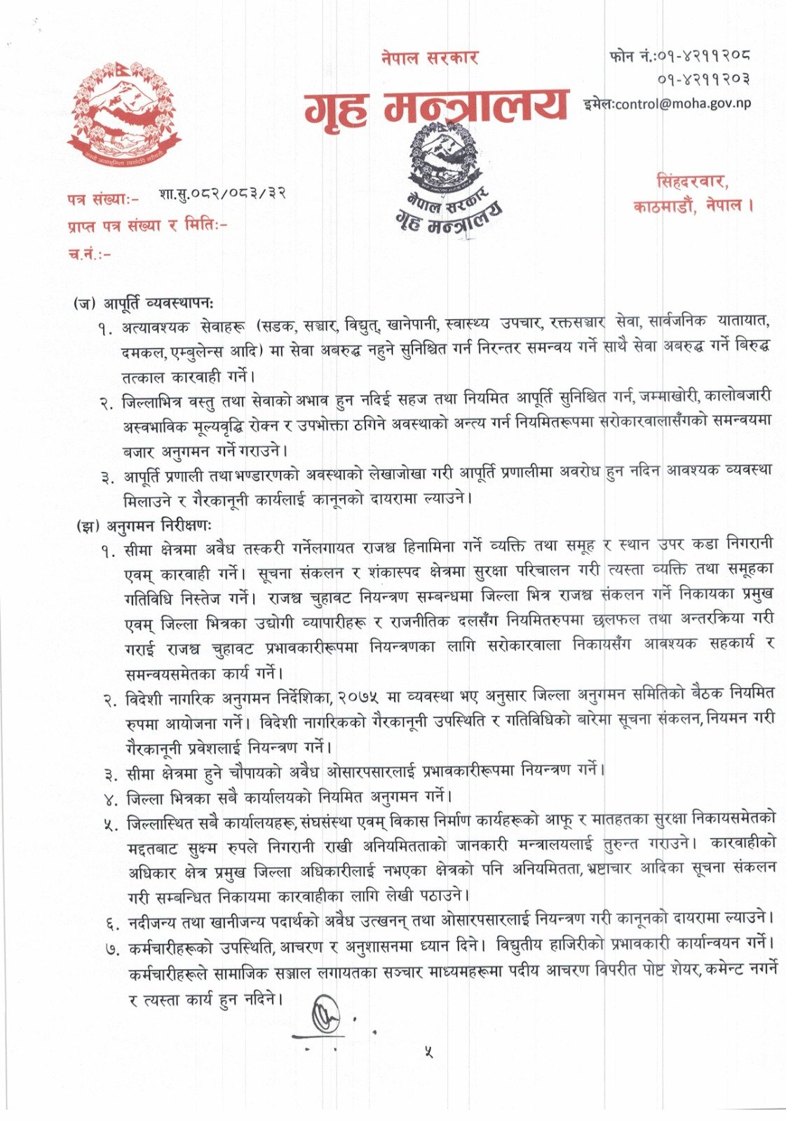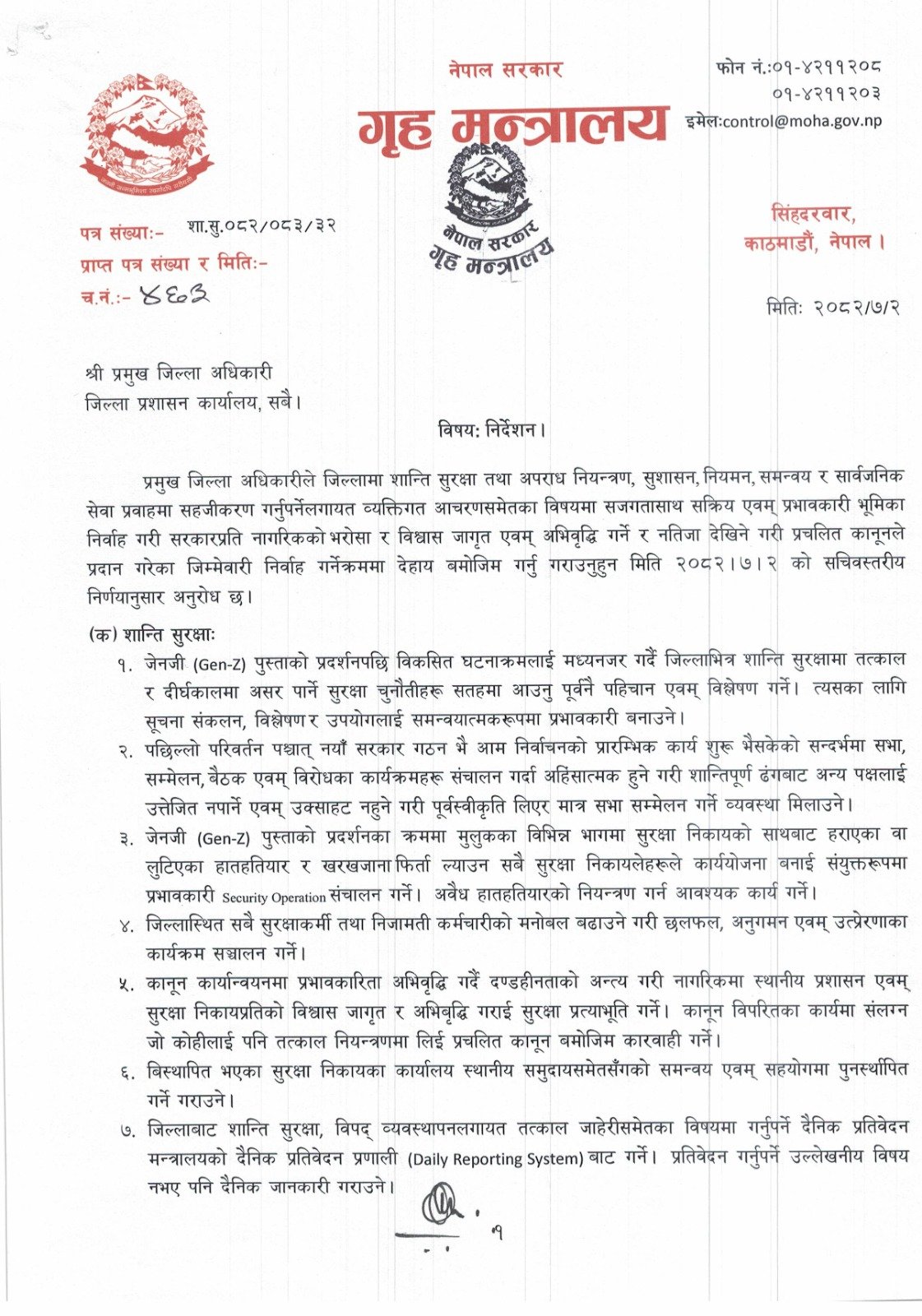 काठमाडौं । गृह मन्त्रालयले ७७ वटै जिल्लाका जिल्लाका प्रमुख जिल्ला अधिकारीलाई शान्ति सुरक्षा कायम राख्न निर्देशन दिएको छ ।