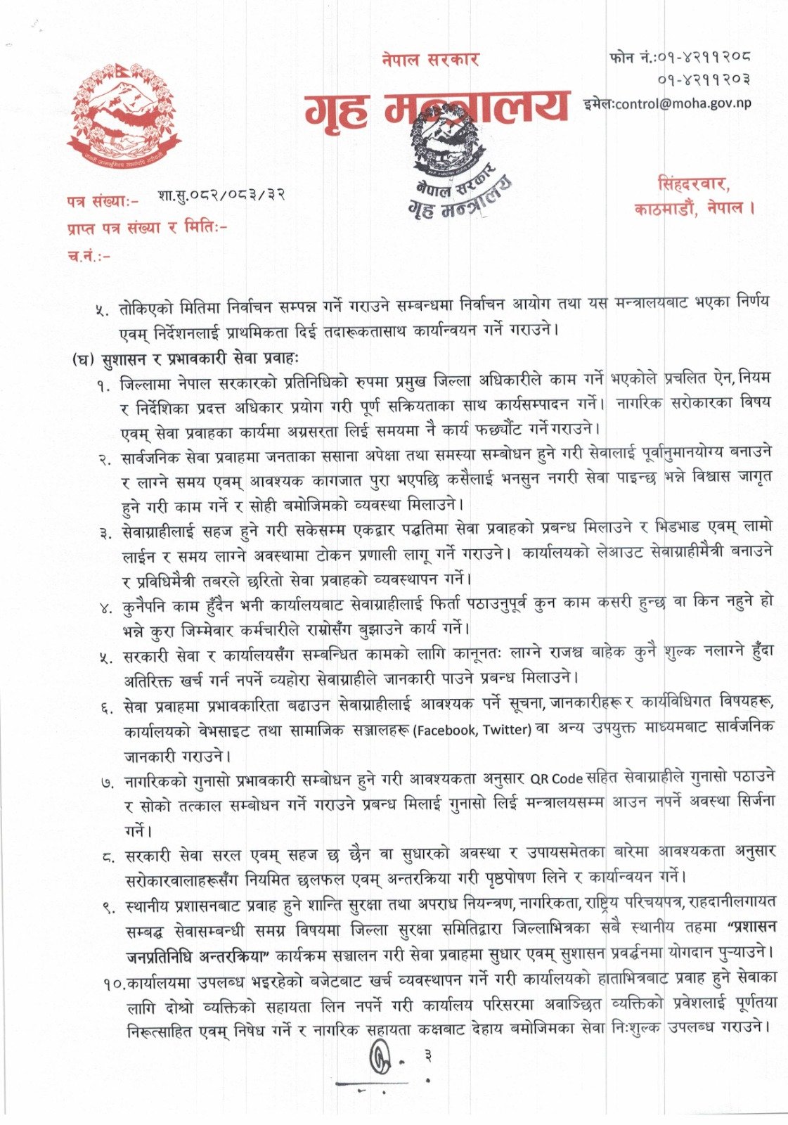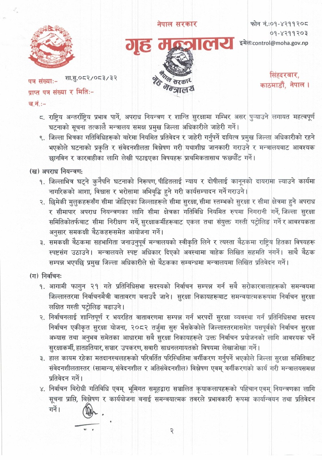 आइतबार मन्त्रालयले सबै जिल्लाका प्रमुख जिल्ला अधिकारीलाई परिपत्र गर्दै शान्ति सुरक्षा कायम राख्दै निर्वाचनमैत्री वातावरण बनाउन निर्देशन दिएको हो ।