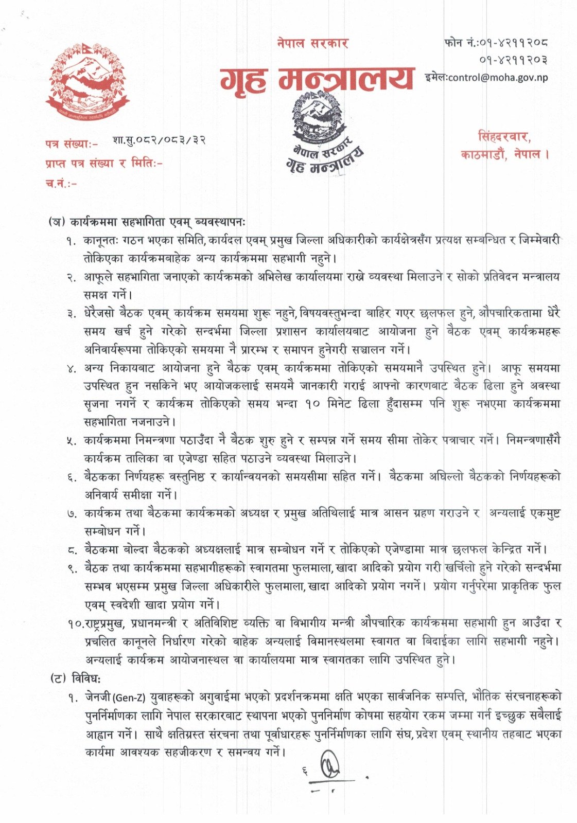 निर्देशनमा भनिएको छ, ‘विभिन्न बहानामा हुन सक्ने अवाञ्छित गतिविधि, चन्दा आतंक, र कानुन विपरीतका कार्यलाई कडाइका साथ नियन्त्रण गरी आम नागरिकको जिउधनको सुरक्षामा कुनै कसर बाँकी नराख्नू ।’