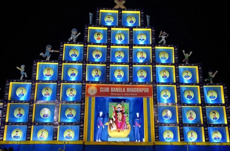 झापा । झापाको भद्रपुर–६ मा नेपाली राष्ट्रिय क्रिकेट खेलाडीहरूको तस्वीर राखेर आकर्षक कालीपूजा पण्डाल निर्माण गरिएको छ । ‘जेन–जी’ आन्दोलनपछि देशमा देखिएको राजनीतिक अस्थिरताबाट निराश जनतालाई भर्खरै राष्ट्रिय क्रिकेट टोलीले दिएको उत्साह र खुसीलाई आत्मसात् गर्दै क्लब बाङ्गला भद्रपुरले पण्डाल निर्माण गरेको पूजा समितिका संयोजक विजय साहले बताए ।