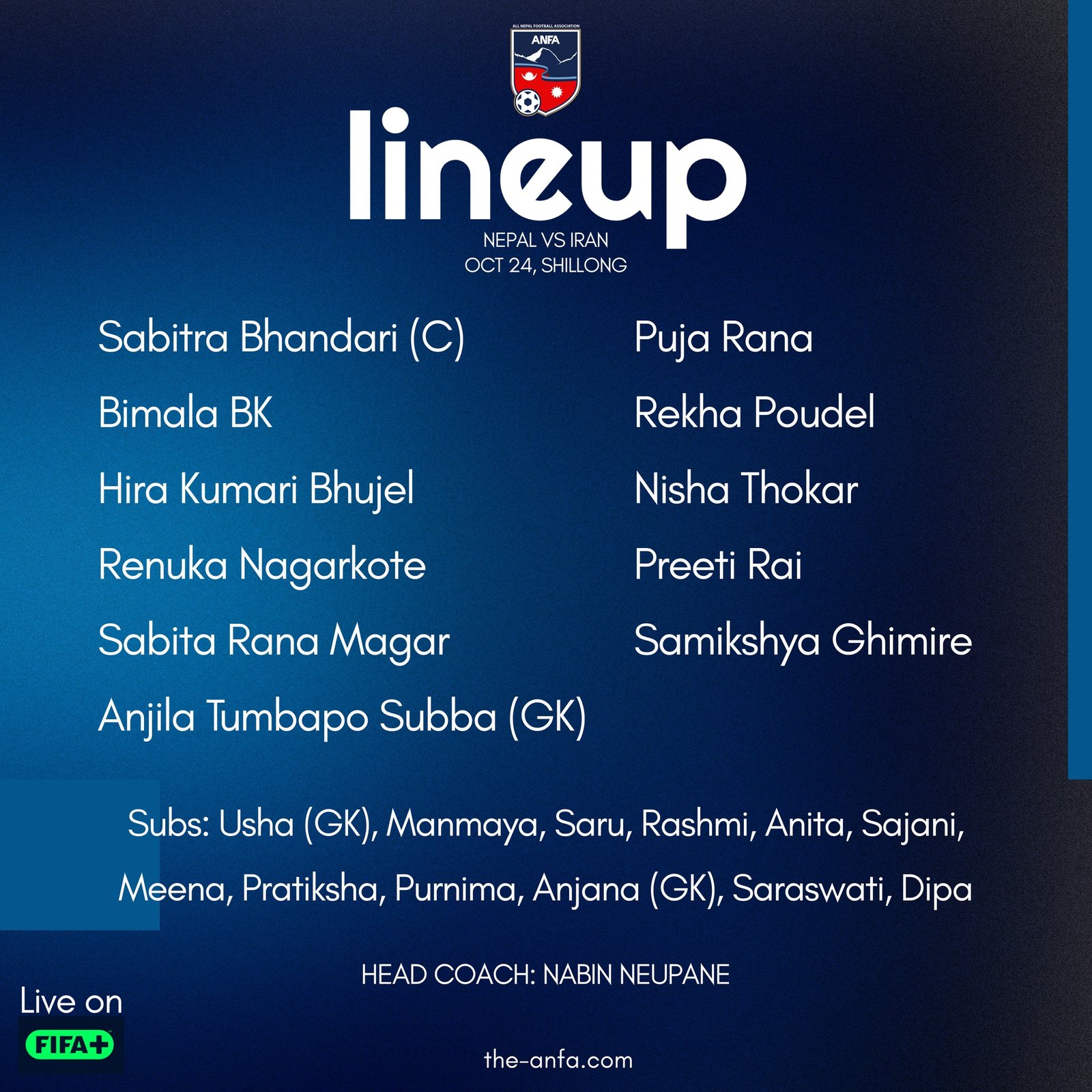 यस्तो छ नेपालको शुरुवाती ११ : एन्जिला तुम्बापो सुब्बा(गोलकिपर), बिमला विक, हिरा कुमारी भुजेल, समिक्षा घिमिरे, निशा थोकर, पुजा राना; रेनिका नगरकोटी, प्रिती राई, सविता राना मगर; रेखा पौडेल, सावित्रा भण्डारी(कप्तान)