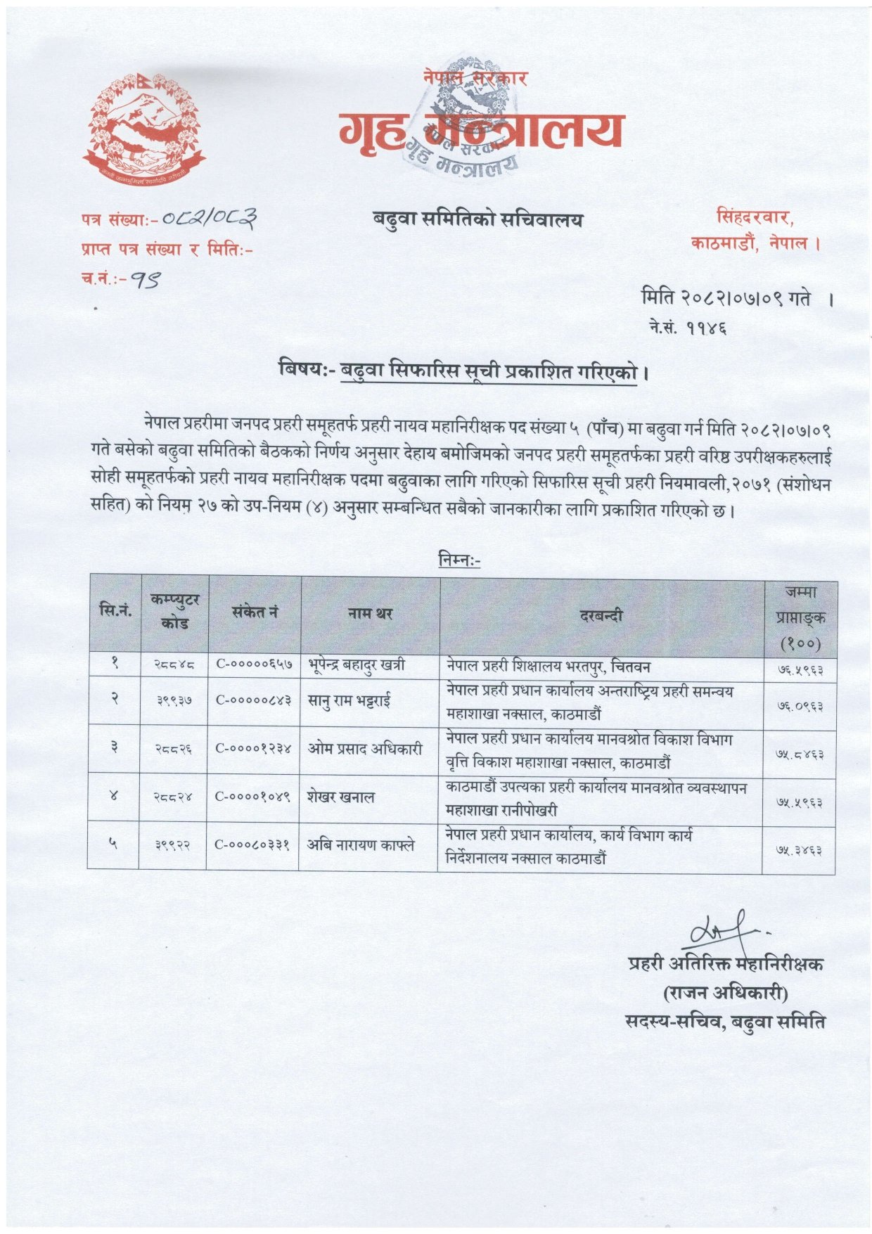 उनीहरूलाई प्रहरी नियमावली, २०७१ (संशोधन सहित) को नियम २७ को उपनियम (४) बमोजिम बढुवा गरिएको बढुवा समितिका सदस्यसचिव एवम् प्रहरी अतिरिक्त महानिरीक्षक (एआइजी) राजन अधिकारीले जानकारी दिए ।