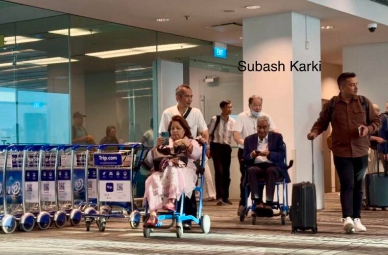सिंगापुर विमानस्थलबाट बाहिरिँदै गर्दा ह्विलचेयरमा देउवा दम्पती