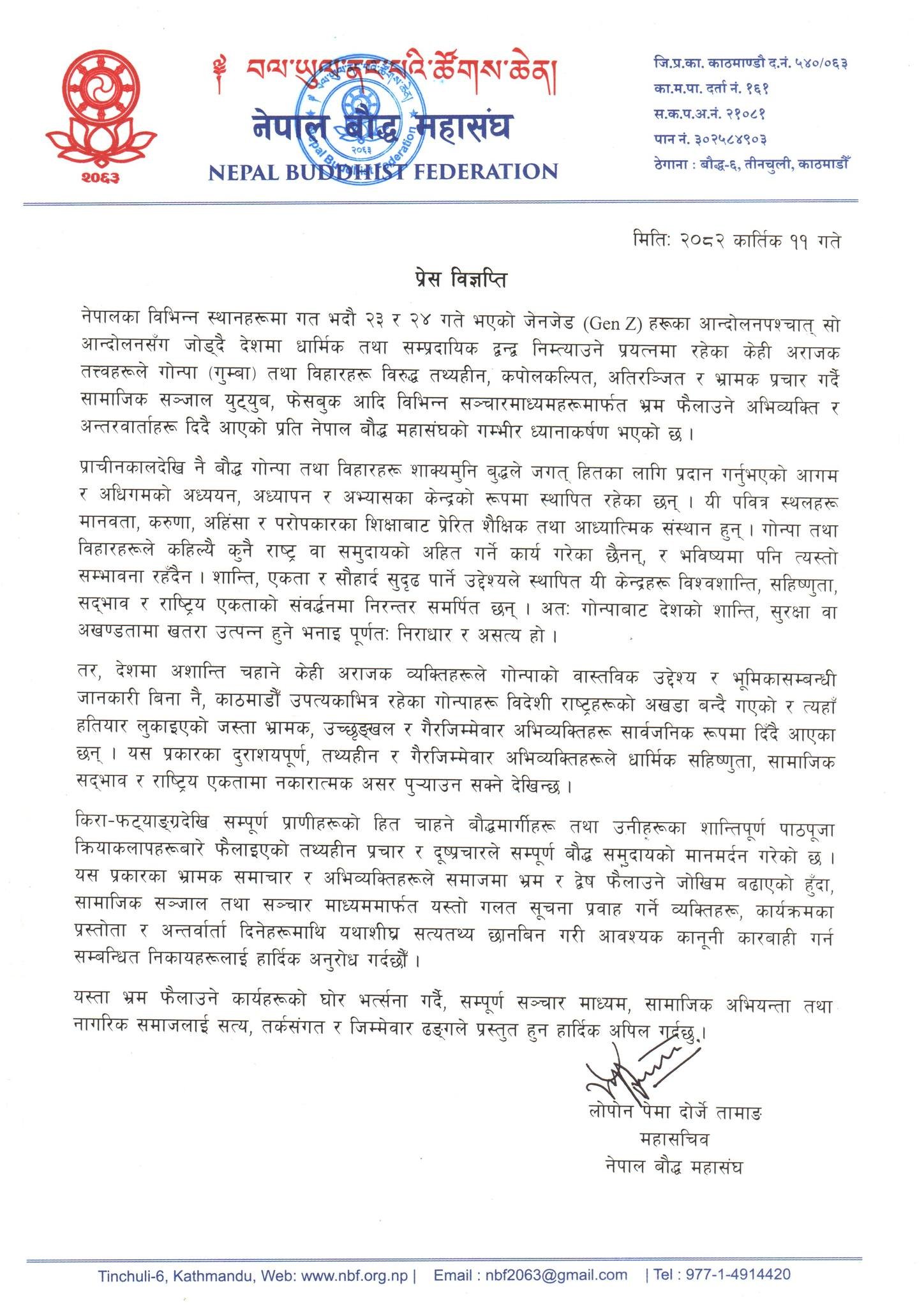 विज्ञप्तिमा भनिएको छ, ‘देशमा अशान्ति चाहने केही अराजक व्यक्तिहरूले गोन्पाको वास्तविक उद्देश्य र भूमिकासम्बन्धी जानकारी बिना नै, काठमाडौँ उपत्यकाभित्र रहेका गोन्पाहरू विदेशी राष्ट्रहरूको अखडा बन्दै गएको र त्यहाँ हतियार लुकाइएको जस्ता भ्रामक, उच्छृङ्खल र गैरजिम्मेवार अभिव्यक्तिहरू सार्वजनिक रूपमा दिँदै आएका छन् । यस प्रकारका दुराशयपूर्ण, तथ्यहीन र गैरजिम्मेवार अभिव्यक्तिहरूले धार्मिक सहिष्णुता, सामाजिक सद्भाव र राष्ट्रिय एकतामा नकारात्मक असर पुर्याउन सक्ने देखिन्छ ।’