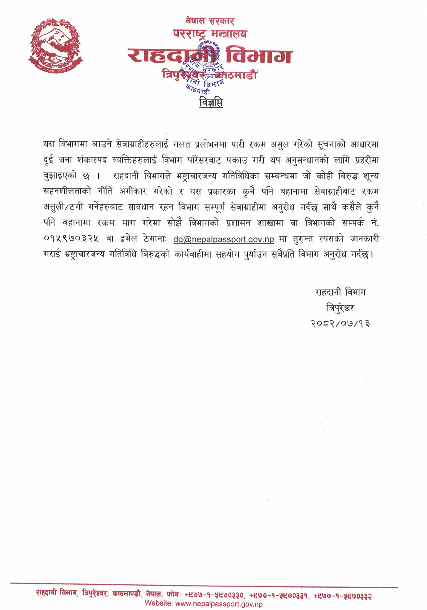 साथै विभागले कसैले रकम माग्ने वा कुनै किसिमको अनुचित कार्य गर्ने प्रयास गरेमा जानकारी गराउन आग्रह गरेको छ।