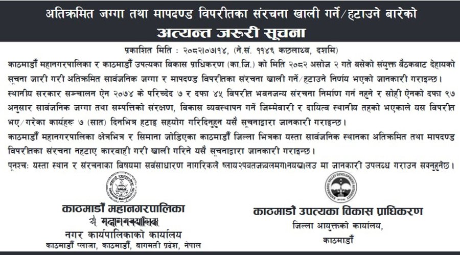 शुक्रबार सार्वजनिक सूचना जारी गर्दै महानगरले असोज २ गतेको काठमाडौँ महानगरपालिका र काठमाडौँ उपत्यका प्राधिकरणको निर्णय अनुसार सात दिनभित्र अतिक्रमित जग्गा र मापदण्ड विपरीतका संरचना खाली गर्न अनुरोध गरिएको उल्लेख गरेको छ ।