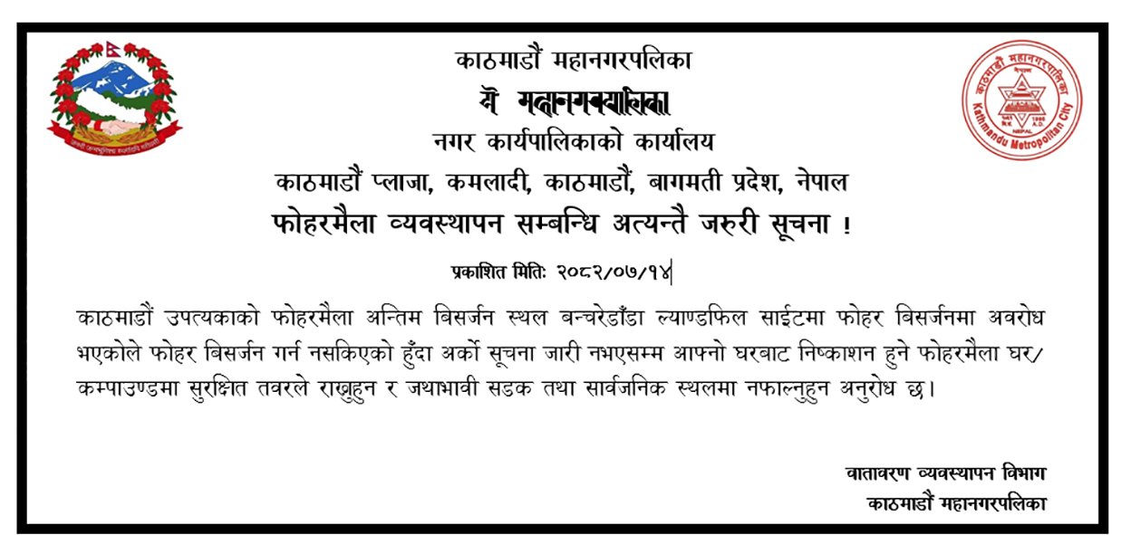 महानगरले भनेको छ, ‘अर्को सूचना जारी नभएसम्म आफ्नो घरबाट निस्कासन हुने फोहोर मैला घर/कम्पाउण्डमा सुरक्षित तवरले राख्नुहुन र जथाभावी सडक तथा सार्वजनिक स्थलमा नफाल्नुहुन अनरोध छ ।’