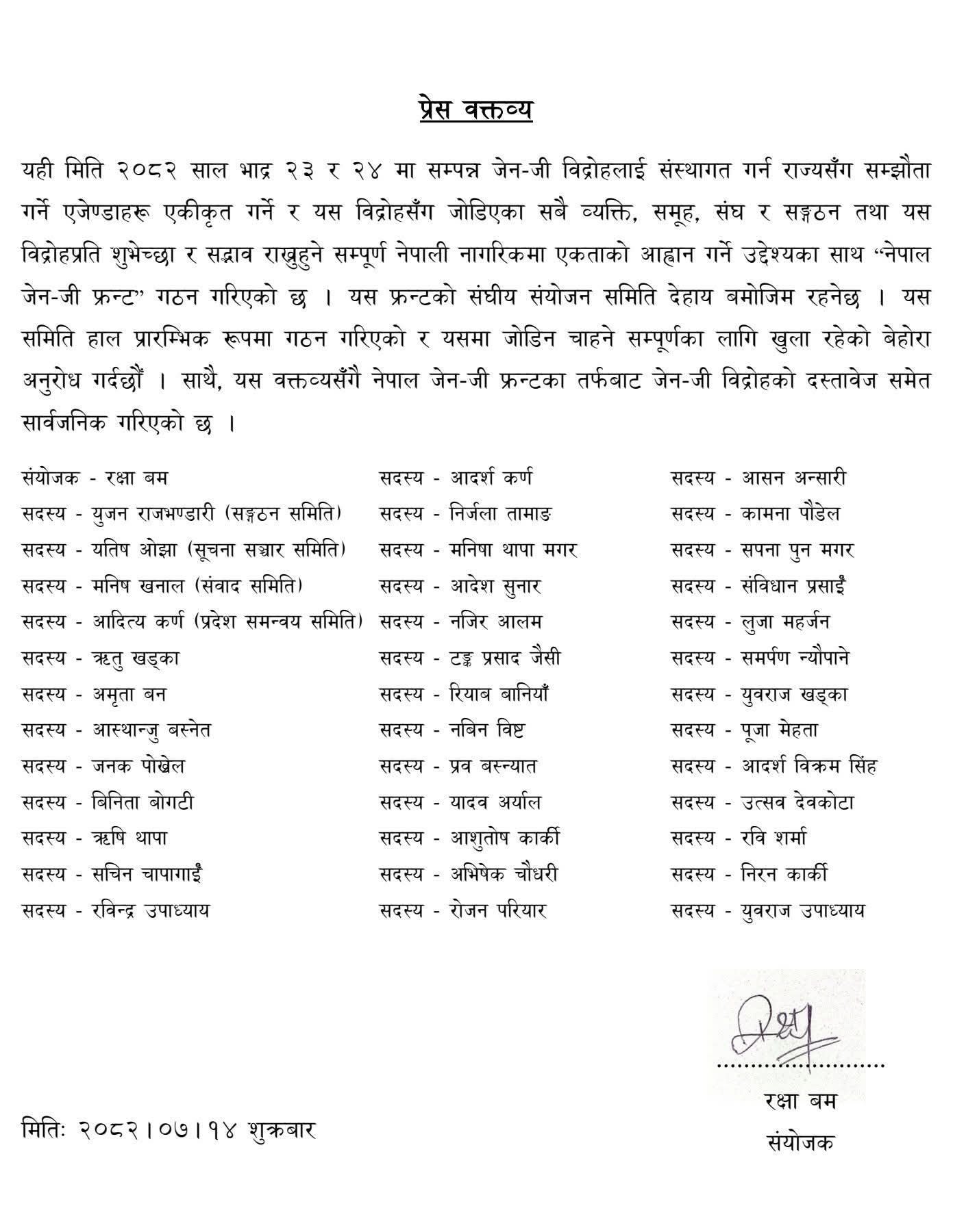 काठमाडौं । रक्षा बमको संयोजकत्वमा ‘जेनजी फ्रन्ट’ गठन गरिएको छ । जेनजी विद्रोहलाई संस्थागत गर्न राज्यसँग सम्झौता गर्ने एजेन्डाहरु एकीकृत गर्ने र यस विद्रोहसँग जोडिएका सबै व्यक्ति, समूह, संघ र संगठन तथा विद्रोहप्रति शुभेच्छा राख्ने सबै नेपाली नागरिकमा एकताको आह्वान गर्ने उद्देश्य रहेको जनाइएको छ ।