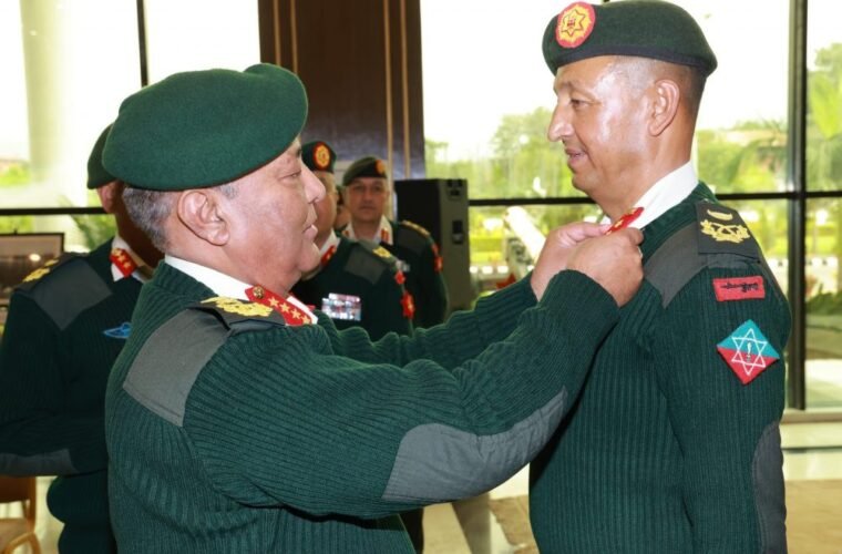 काठमाडौं । प्रधान सेनापति अशोकराज सिग्देलले उपरथी दर्जामा पदोन्नति भएका सहायक रथी हिम्मतबहादुर बिष्ट र सहायक रथी विष्णुकुमार खड्कालाई जङ्गी अड्डामा आयोजित आज आयोजित कार्यक्रममा दर्ज्यानी चिन्ह प्रदान गरेका छन् ।