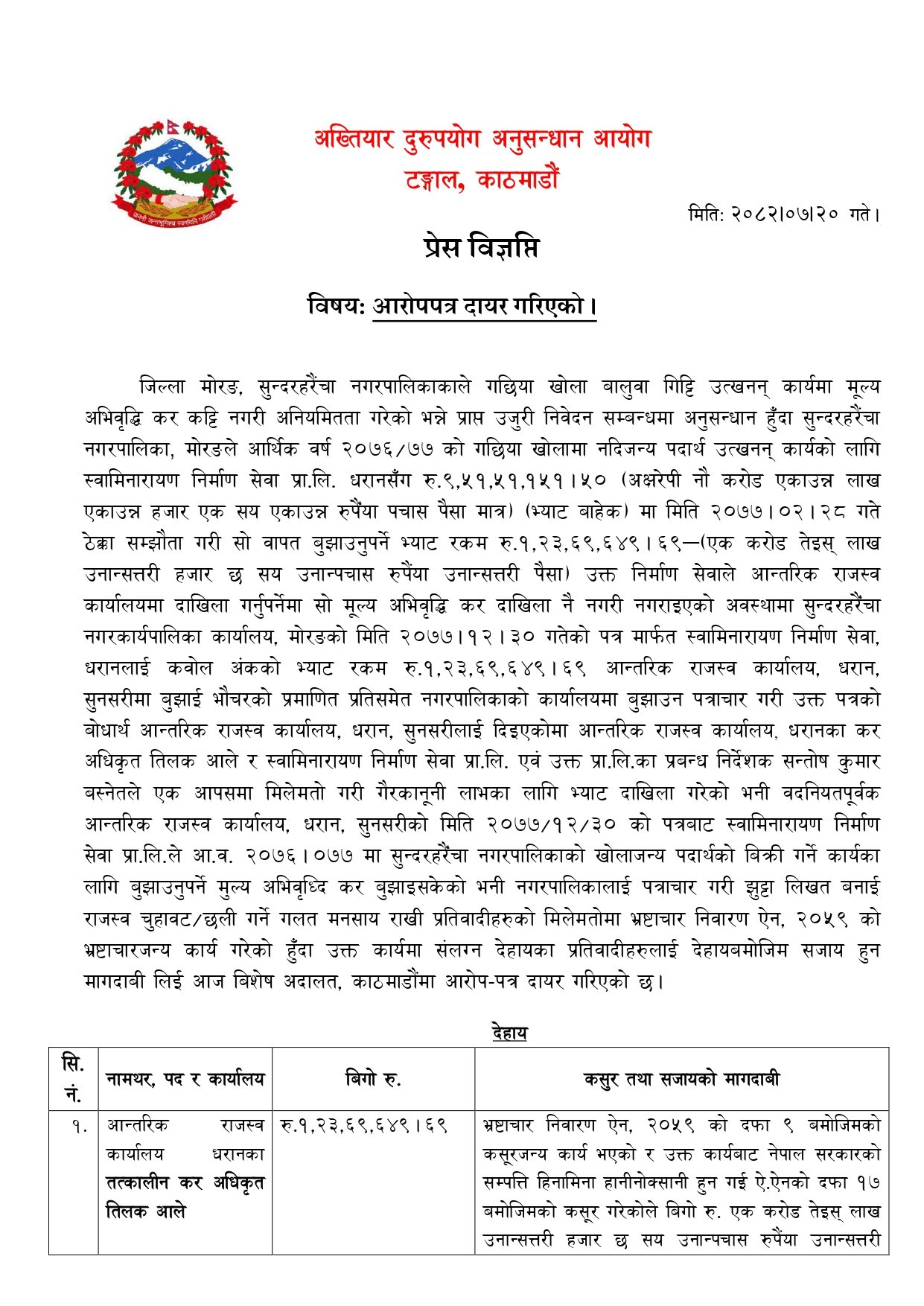 मोरङको सुन्दरहरैँचा नगरपालिकाले गछिया खोलामा नदीजन्य पदार्थ उत्खनन्का लागि स्वामिनारायण निर्माण सेवा प्रालि, धरानसँग ९ करोड ५१ लाख ५१ हजार ५१ (भ्याटबाहेक) मा ठेक्का सम्झौता गरेकोमा कम्पनीले १ करोड २३ लाख ६९ हजार ६४९ भ्याट आन्तरिक राजस्व कार्यालयमा दाखिला गर्नुपर्नेमा अधिकृत र ठेकेदारसँग मिलेमतोमा उक्त रकम अनियमितता गरेको अख्तियारको भनाइ छ ।