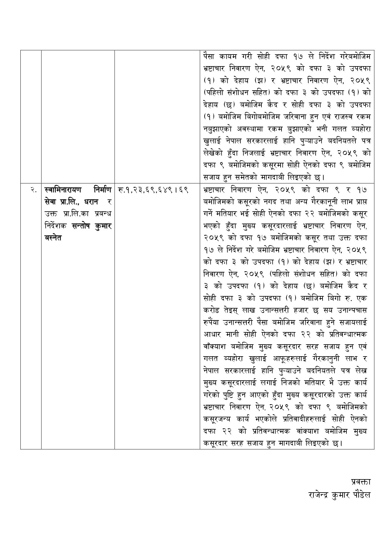 तत्कालीन कर अधिकृत आले र स्वामिनारायण निर्माण सेवा प्रालिका प्रबन्ध निर्देशक सन्तोषकुमार बस्नेतलाई जनही १ करोड २३ लाख ६९ हजार ६४९ कायम गरी सोही बिगोबराबर जरिवाना र कैद सजायको मागदाबीसहित मुद्दा दायर गरिएको हो ।