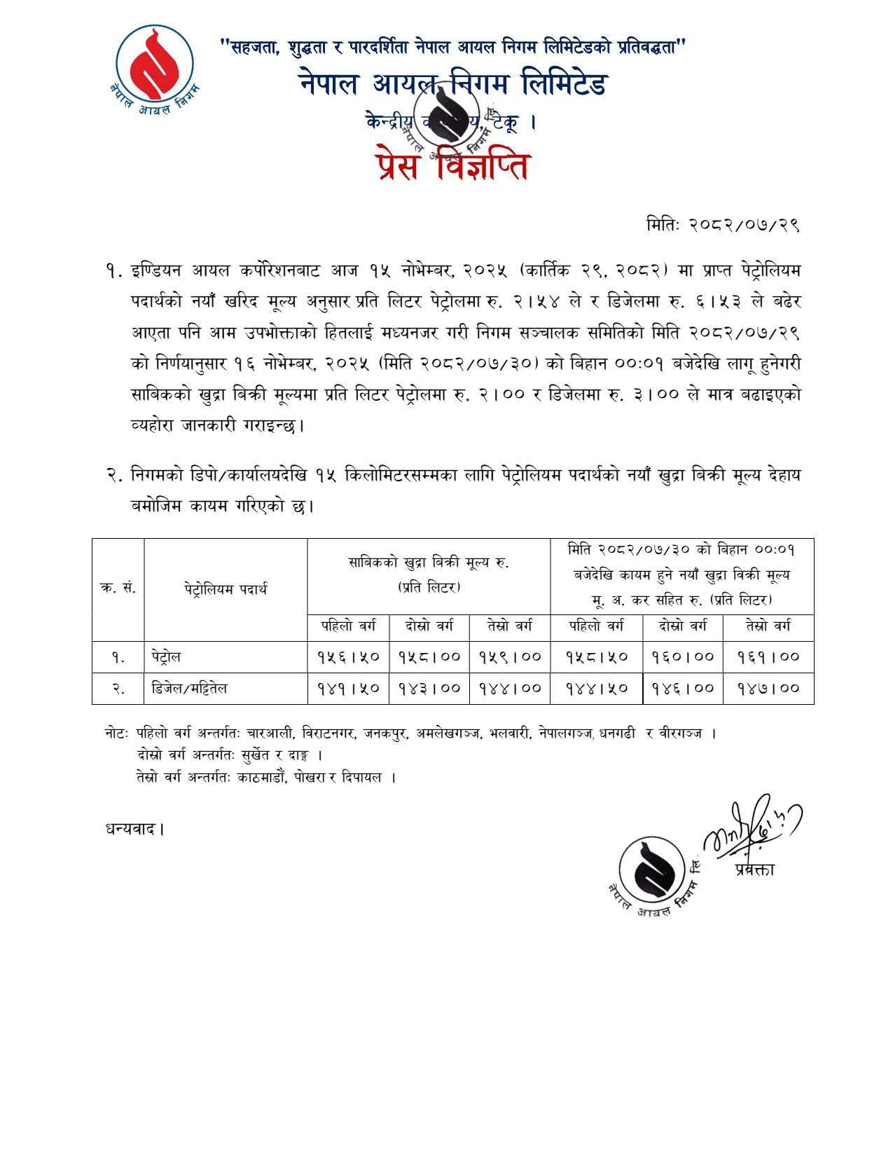 निगमले बढायो पेट्रोलियम पदार्थको मूल्य ३० कार्तिक, २०८२नेपाल समाजअर्थ, मुख्य समाचार काठमाडौं । नेपाल आयल निगमले पेट्रोलियम पदार्थको मूल्य बढाएको छ । शनिबार बसेको निगम संचालक समितिको बैठकले शनिबार मध्यरातिदेखि लागू हुने गरी पेट्रोलमा २ रुपैयाँ र डिजेल/मट्टितेलमा ३ रुपैयाँ मूल्य बढाउने निर्णय गरेको हो ।