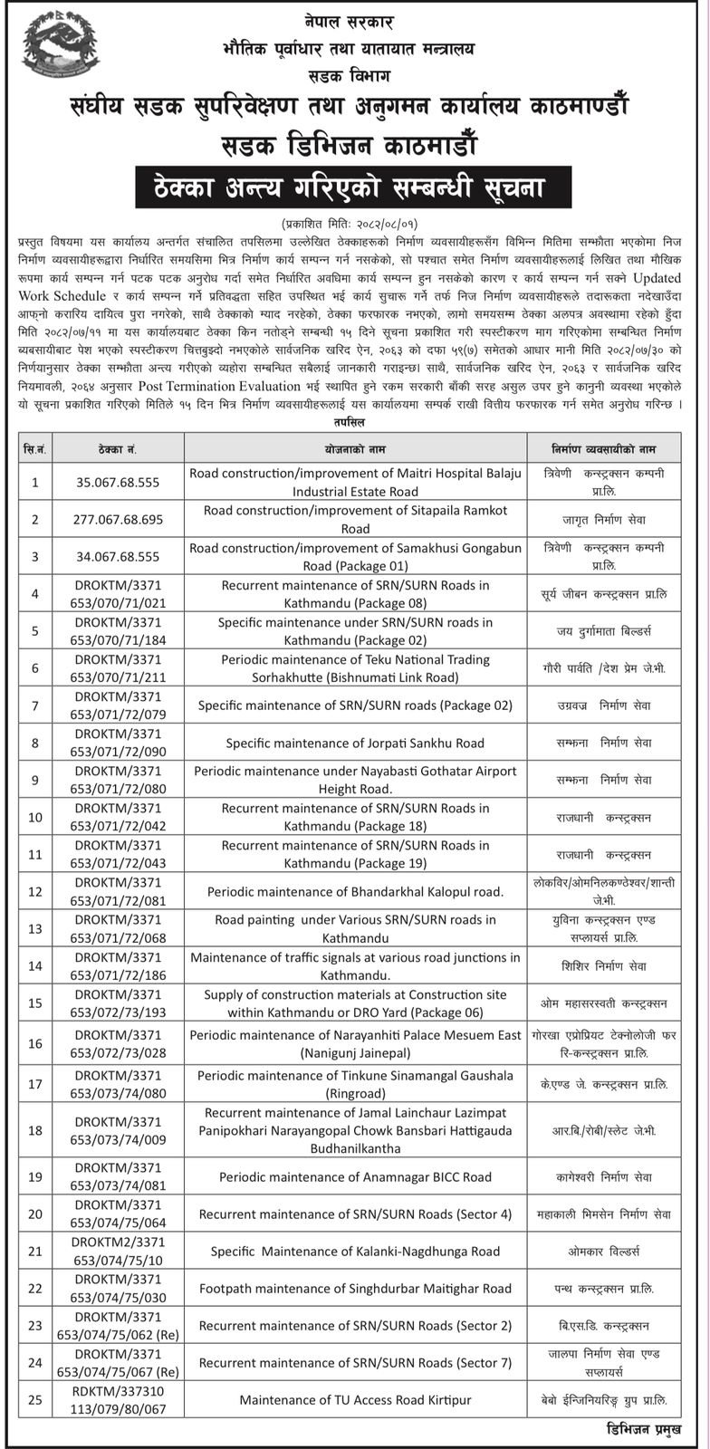 त्यसपछि सडक विभाग मातहतका कार्यालयले रुग्ण ठेक्का तोड्न प्रक्रिया अगाडि बढाएका थिए ।