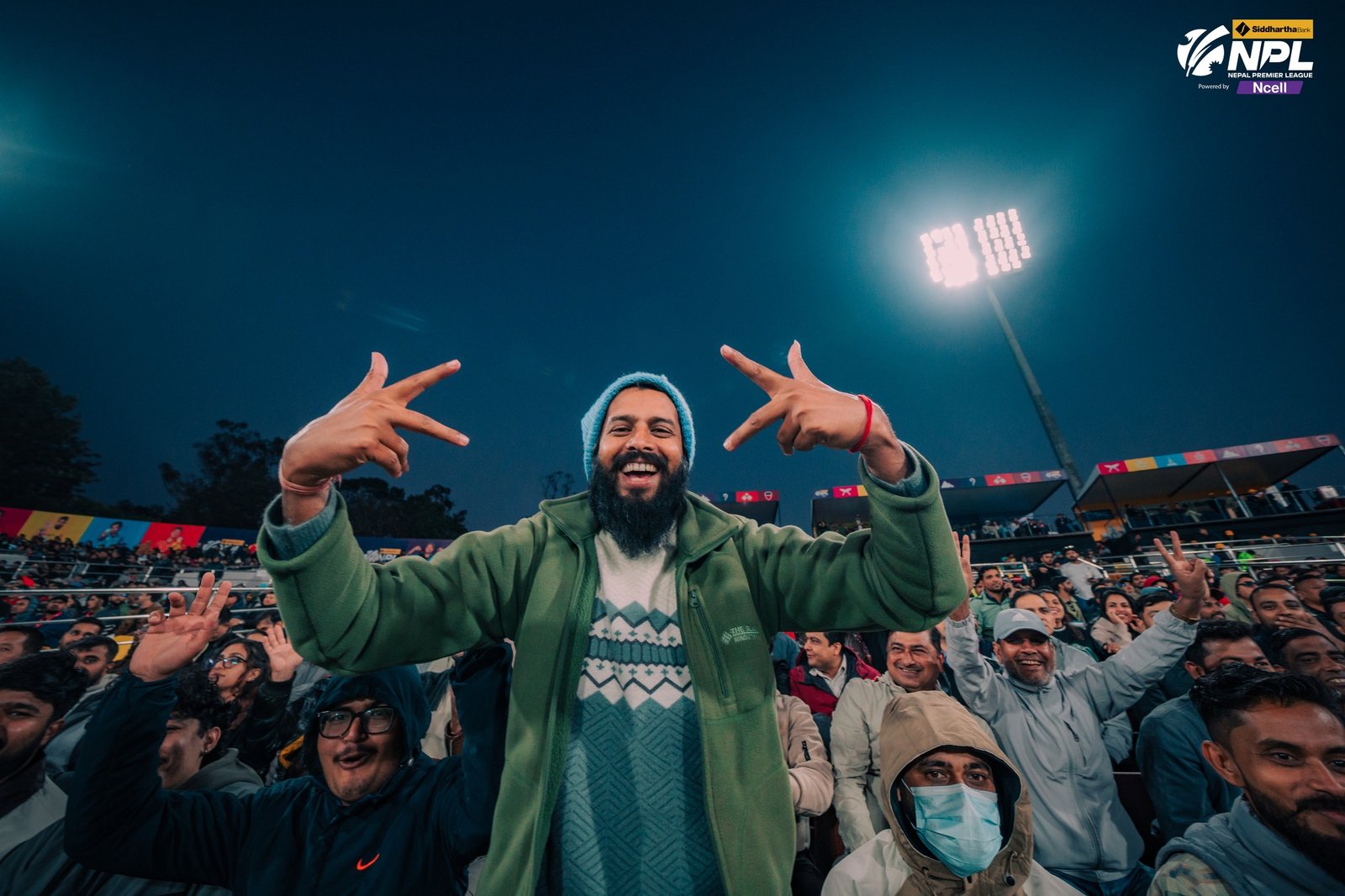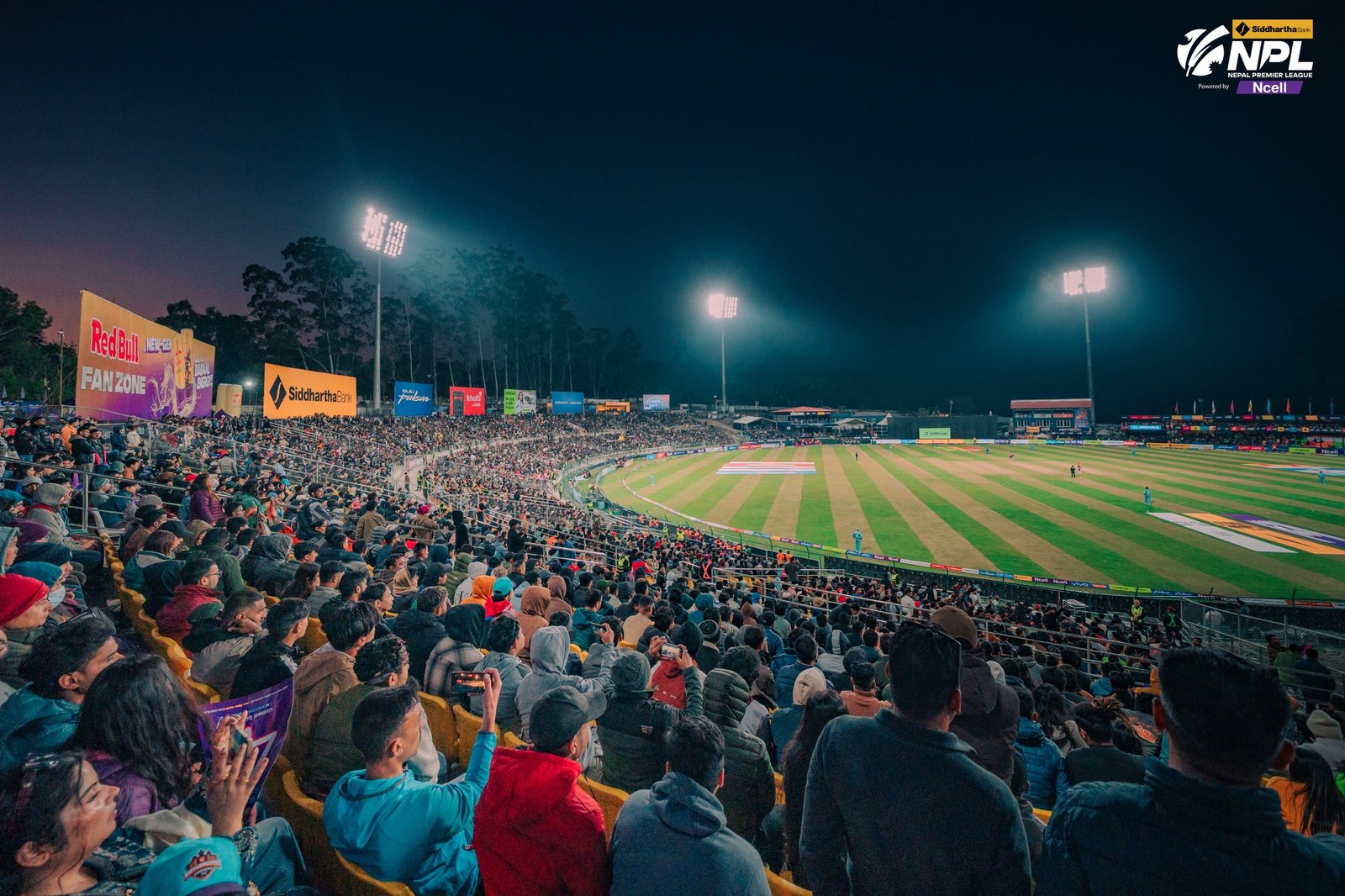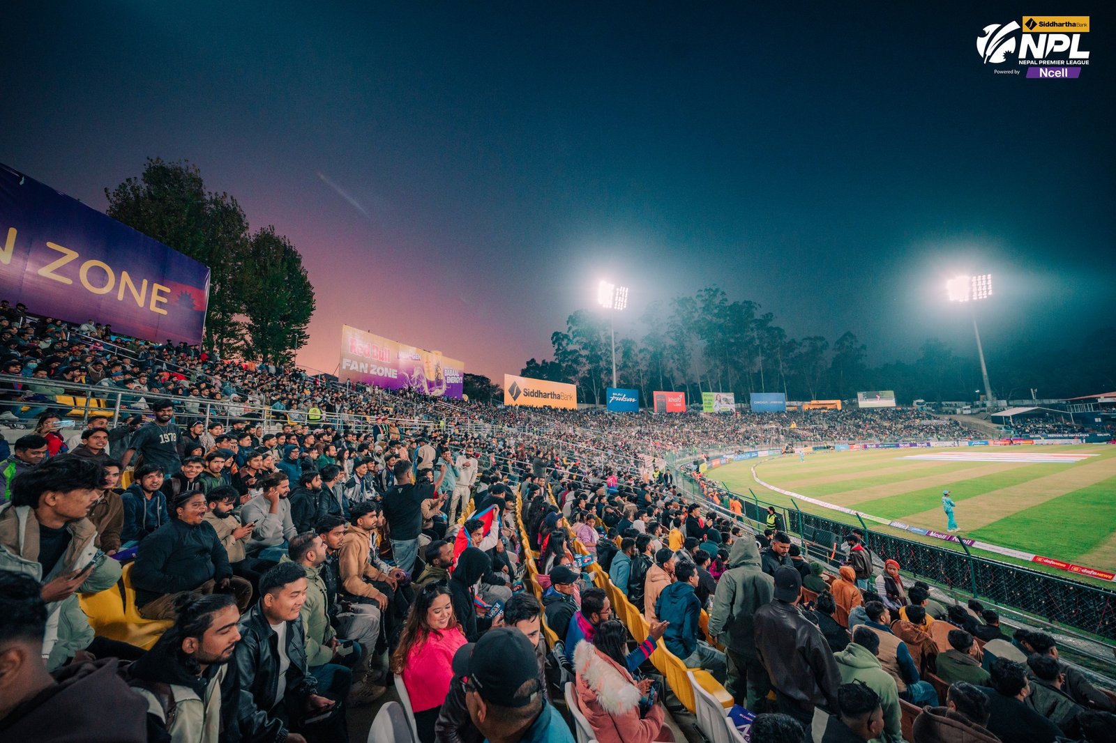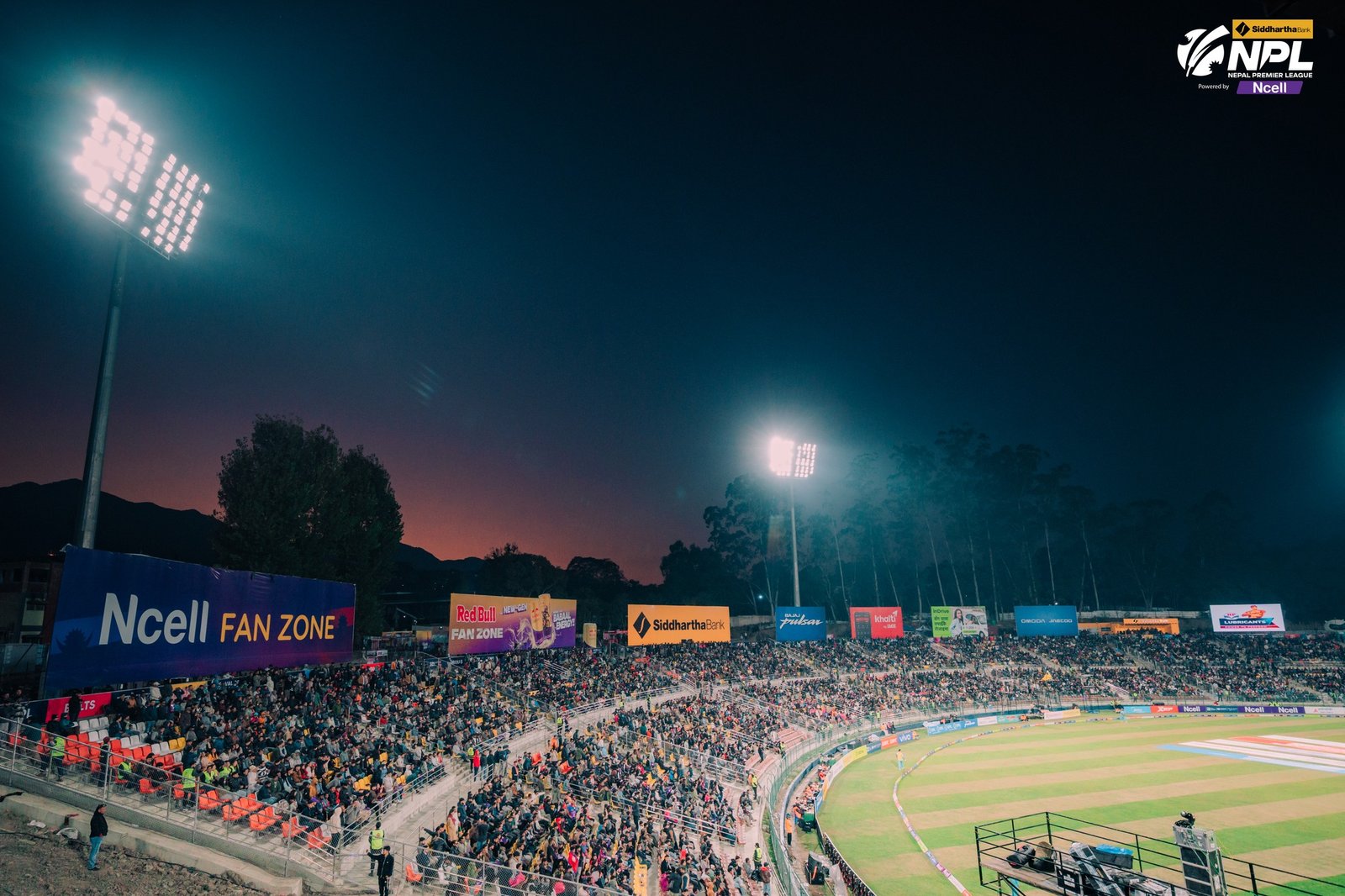 दोस्रो संस्करणको नेपाल प्रिमियर लिग(एनपीएल) अन्तर्गत साविक विजेता जनकपुर बोल्ट्स र काठमाडौं गोर्खाजबीच जारी उद्धाटन खेलमा खेलको मज्जा लिँदै समर्थक । नेपाली क्रिकेटको इतिहासमै घरेलु मैदानमा पहिलोपटक फ्लडलाइटमा खेल भएको हो ।