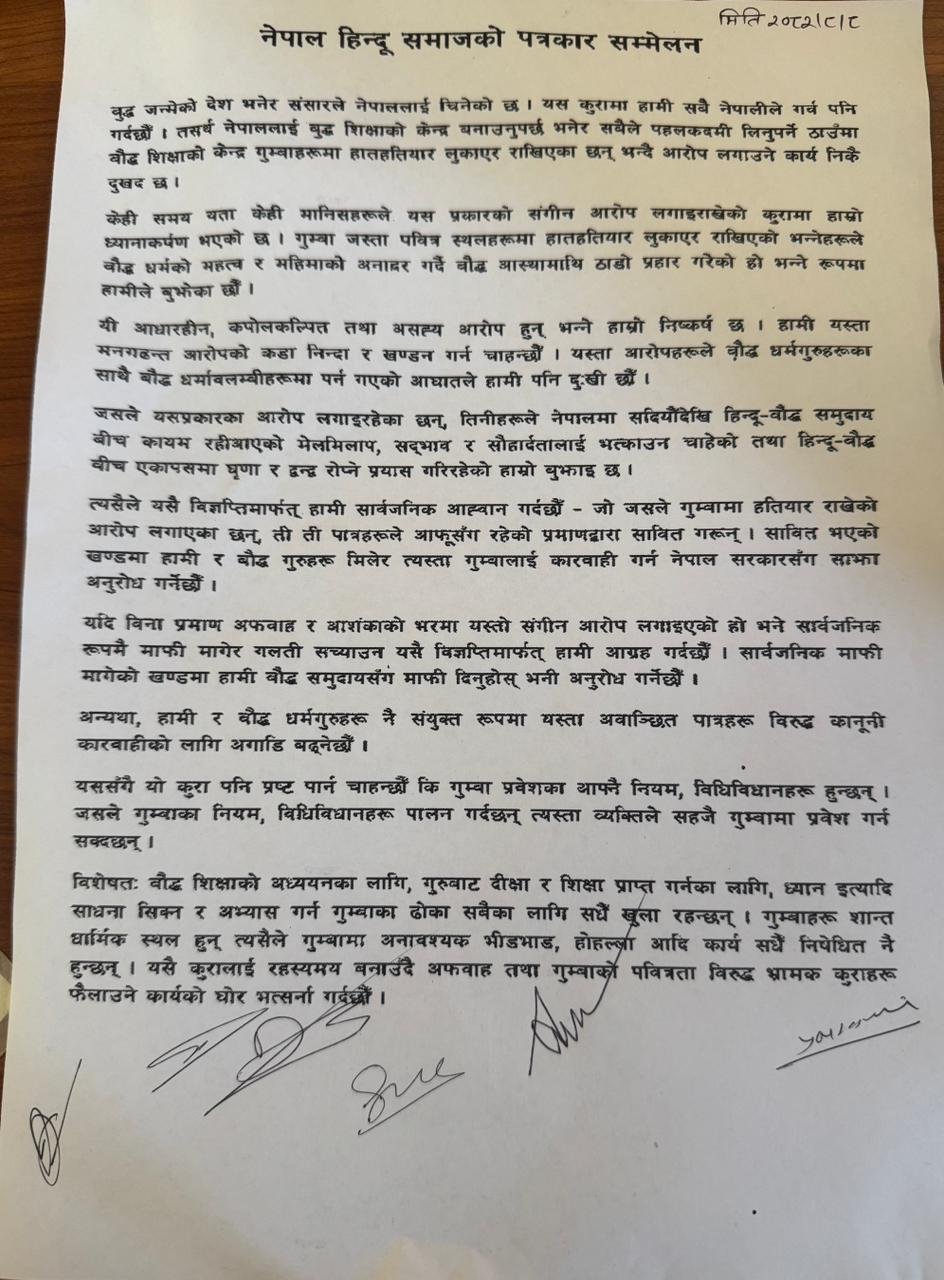 नेपाल हिन्दू समाजले भन्यो-गुम्बाहरूमा हातहतियार लुकाएर राखिएको आरोप लगाउनु निन्दनीय